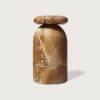 Cult stool/ side table; a hand-sculpted stone from a Mexican marble and Mexican onyx conglomerate, remits to primal sculptural-architectural language while displaying materials in a modernist manner. The piece allows for the specificity of the material’s eccentric pattern formations to rein over its final appearance. Each edition is a unique piece.