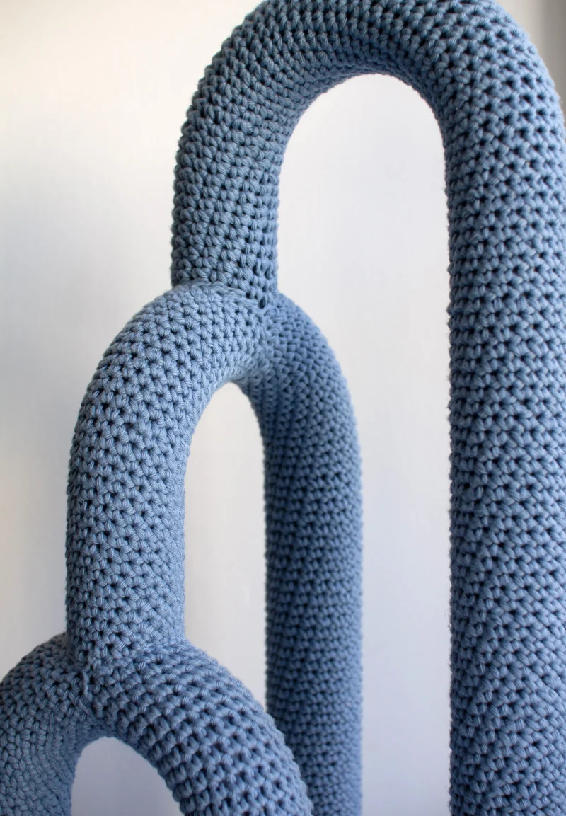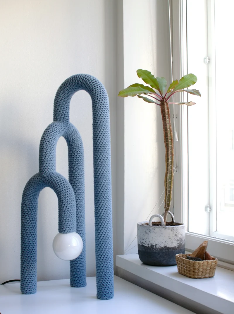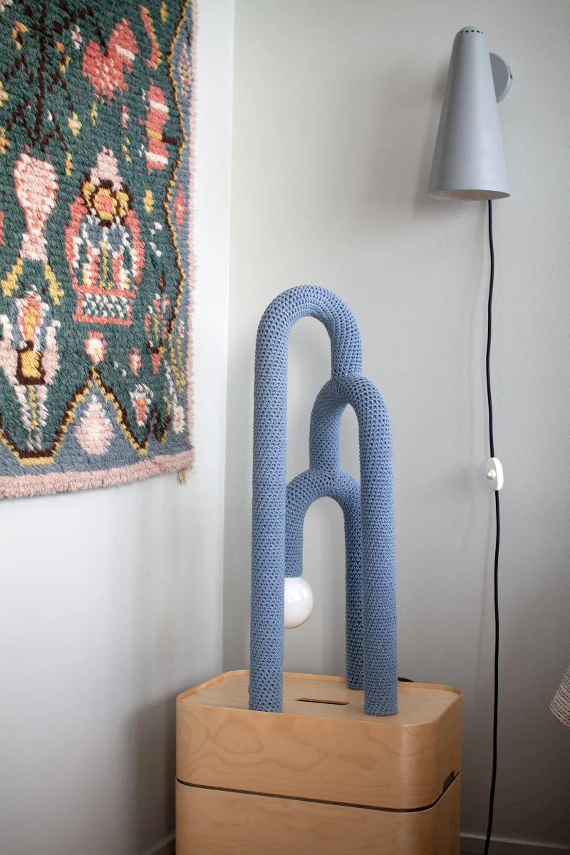 Concealed beneath a soft skin, the inner materiality of the lamp remains hidden, surprising the observer with an unexpected tactile quality. The steel frame, subtly echoing elements of Bauhaus design, is delicately enveloped in a hand-crocheted outer layer. Cumula is not just a source of light; it’s a sensorial exploration, marrying form and function in an intriguing dance of elements.