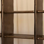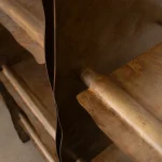 Crafted from solid brass, Curio No.1 – Shelving Unit is built with precision metalworking techniques. A curved brass tube is set between two 3mm brass panels, creating the structural framework. Hand-formed, fluid brass shelves rest on support bars, each featuring distinct edge details. The interplay of rigid structure and flowing surfaces highlights the balance between control and organic form.