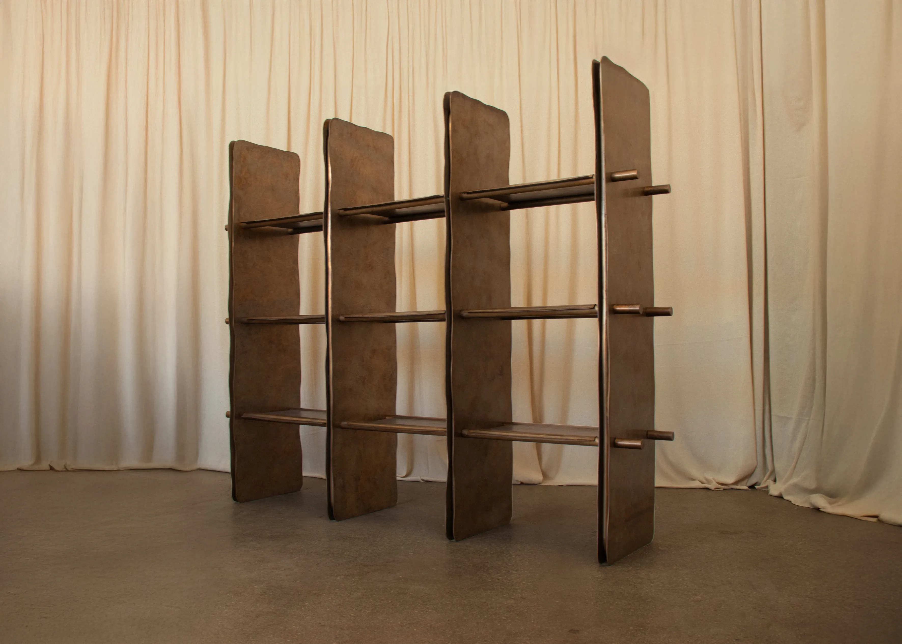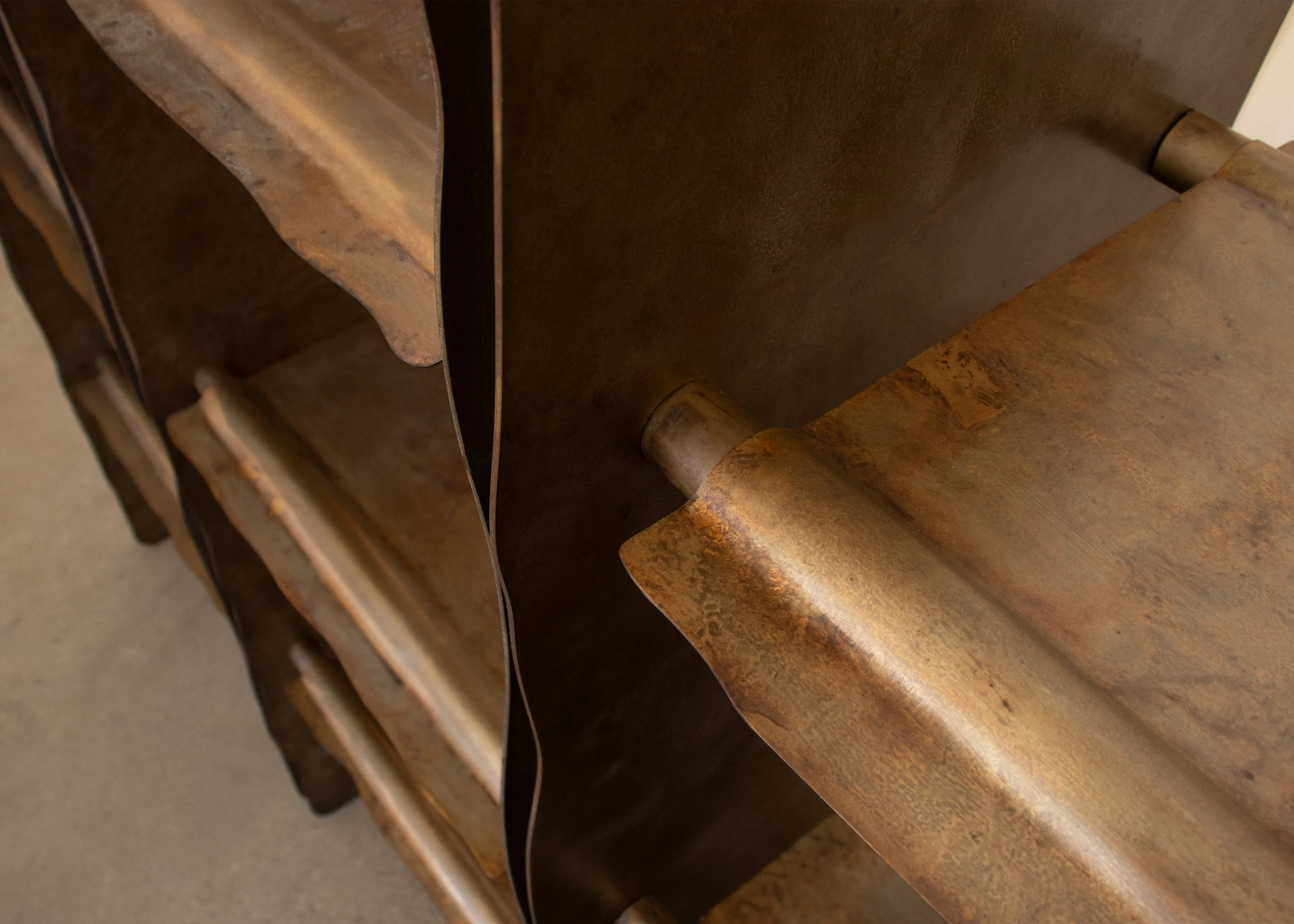 Crafted from solid brass, Curio No.1 – Shelving Unit is built with precision metalworking techniques. A curved brass tube is set between two 3mm brass panels, creating the structural framework. Hand-formed, fluid brass shelves rest on support bars, each featuring distinct edge details. The interplay of rigid structure and flowing surfaces highlights the balance between control and organic form.