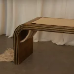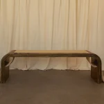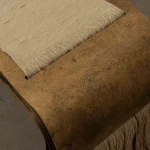Curio No.2 – Bench brings together textile and solid brass with careful attention to material and detail. The seating surface features a wool kilim, woven in Anatolia using traditional techniques. Its brass frame features irregular edge lines, introducing a subtle rhythm that complements the organic texture of the textile. A cast brass comb element—designed in reference to antique weaving tools—is placed as a finishing gesture, echoing the act of aligning fringe threads. The contrast between the softness of the kilim and the weight and permanence of brass creates a balanced yet striking composition.