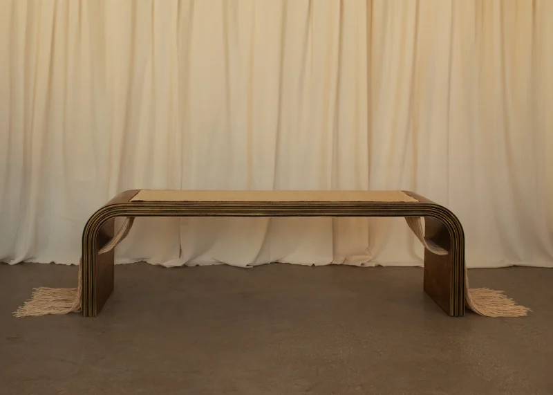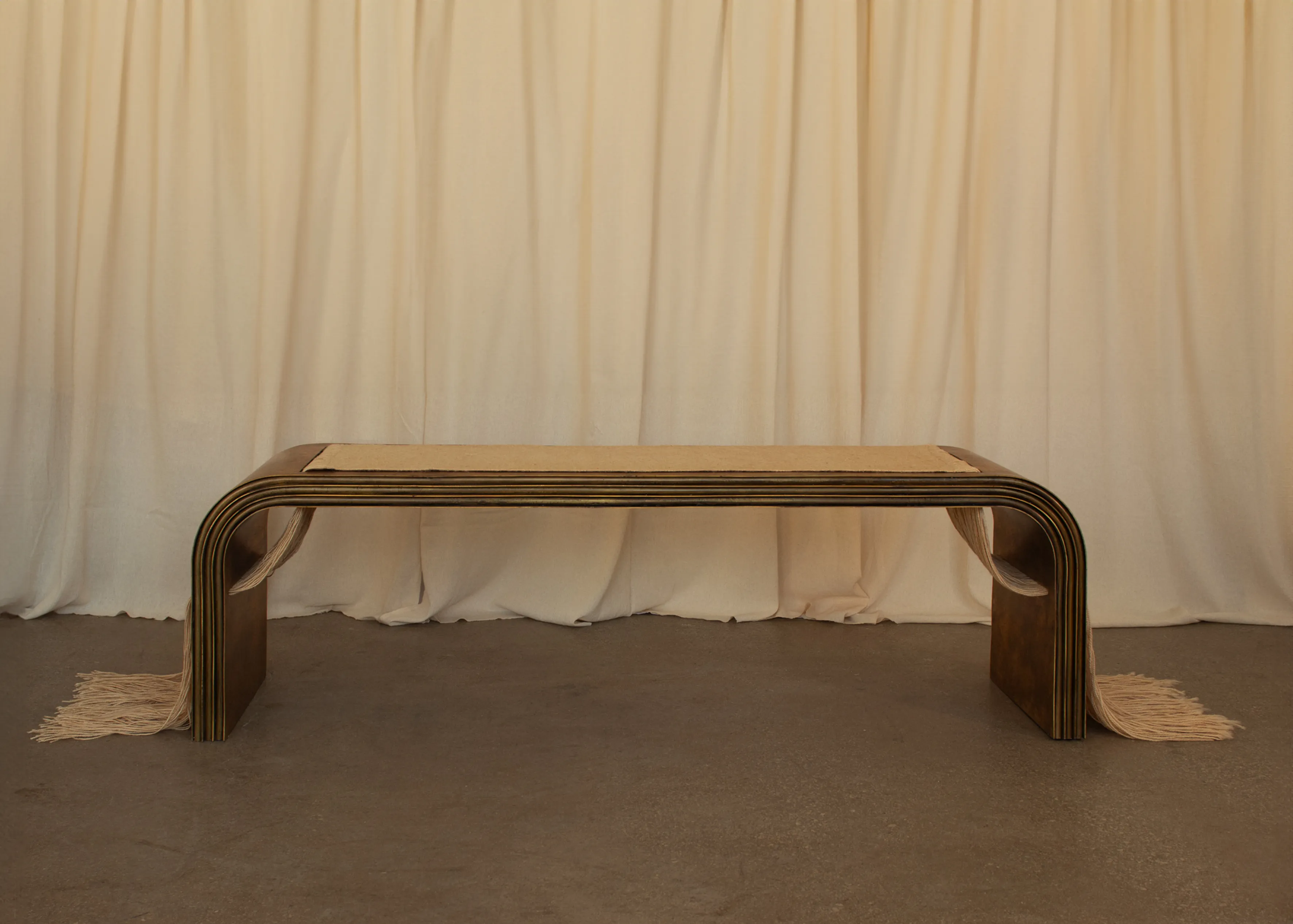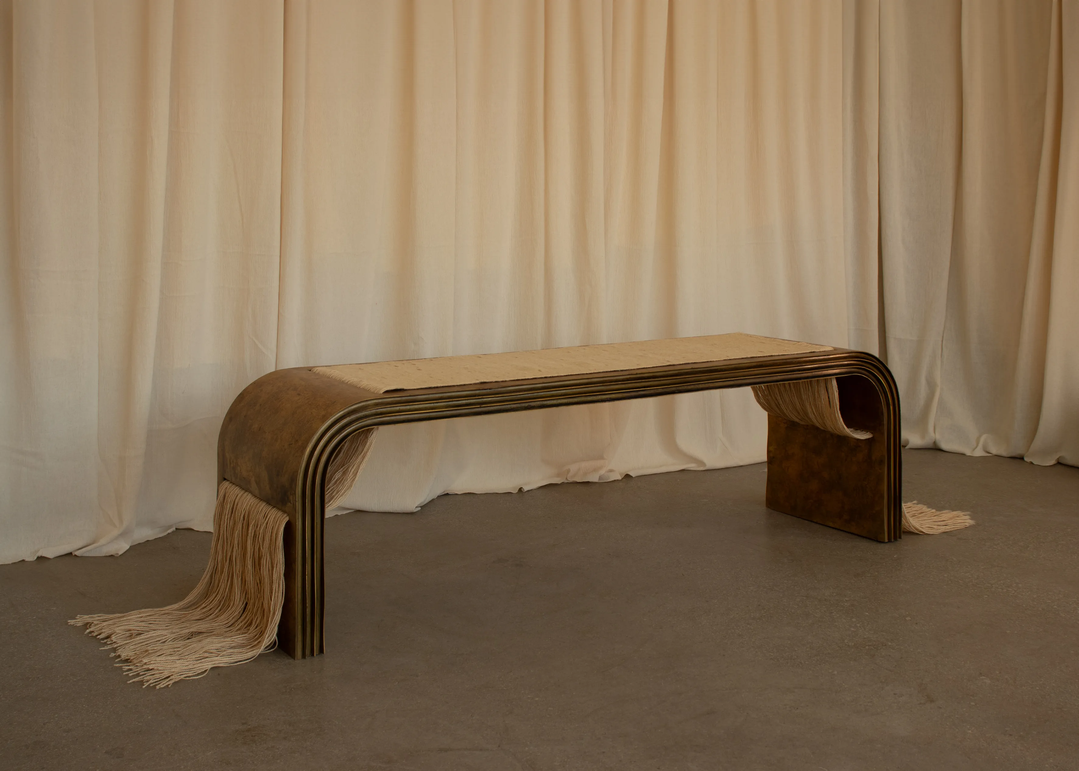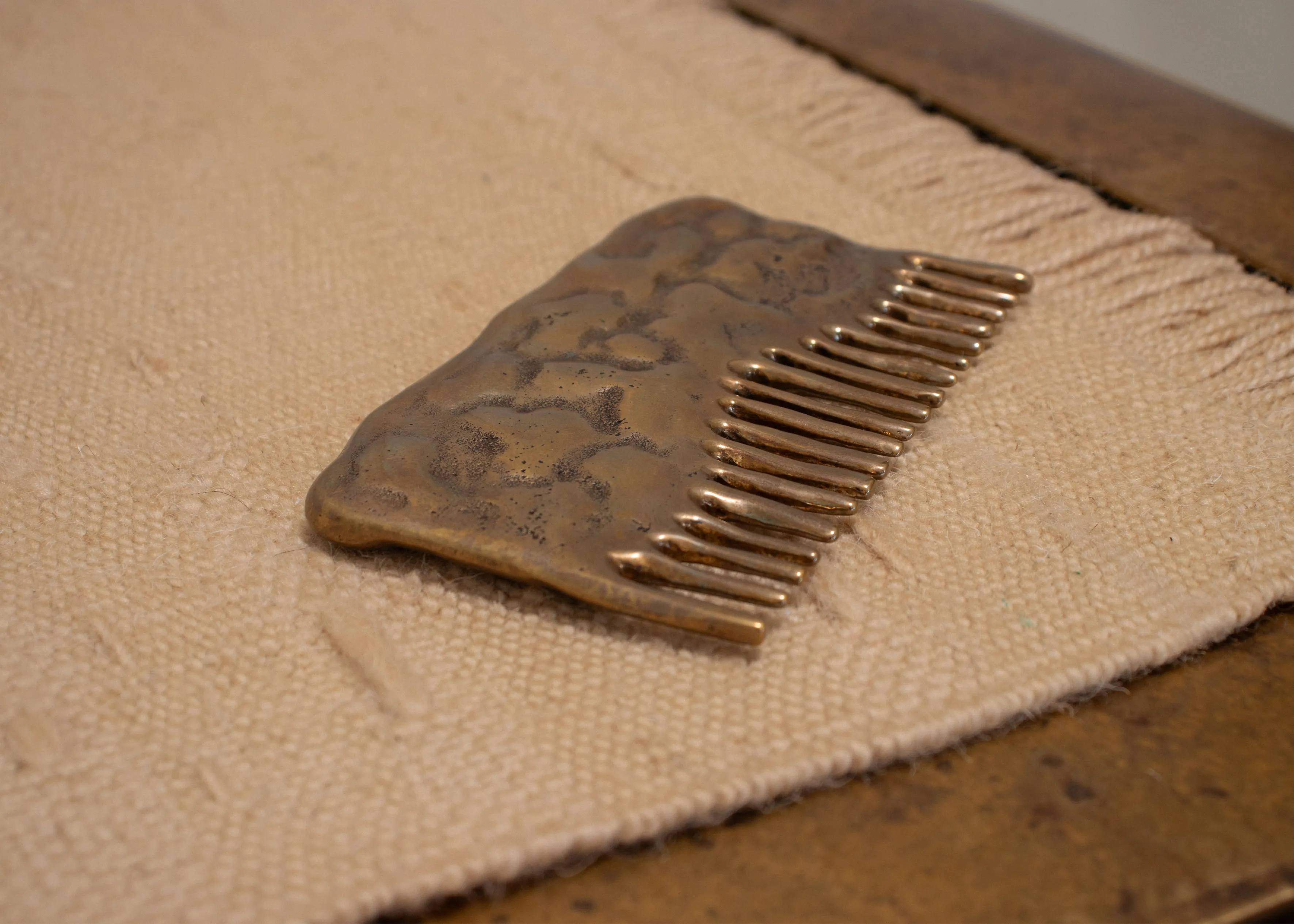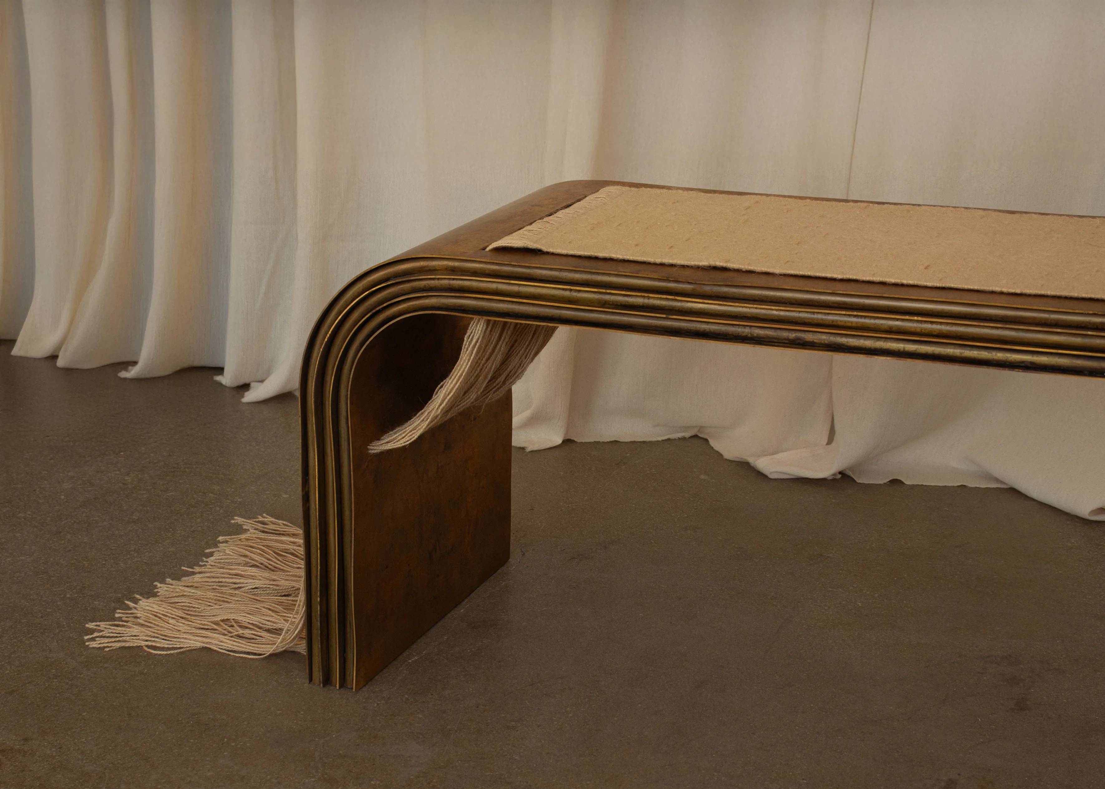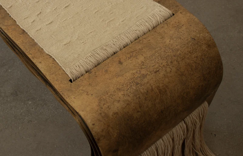 Curio No.2 – Bench brings together textile and solid brass with careful attention to material and detail. The seating surface features a wool kilim, woven in Anatolia using traditional techniques. Its brass frame features irregular edge lines, introducing a subtle rhythm that complements the organic texture of the textile. A cast brass comb element—designed in reference to antique weaving tools—is placed as a finishing gesture, echoing the act of aligning fringe threads. The contrast between the softness of the kilim and the weight and permanence of brass creates a balanced yet striking composition.