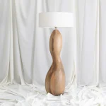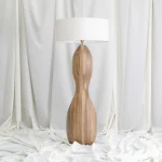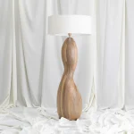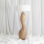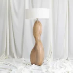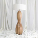 Completely asymmetrical, the Curva Floor Lamp features varying dimensions in its form. The lampshade diameter is 29.5 inches, while the diameter in the lamp’s body varies between 16.5, 10, and 6 inches. Despite its asymmetry, the lamp is completely stable, thanks to its perfectly aligned center and the grounding weight of being made entirely out of solid wood.