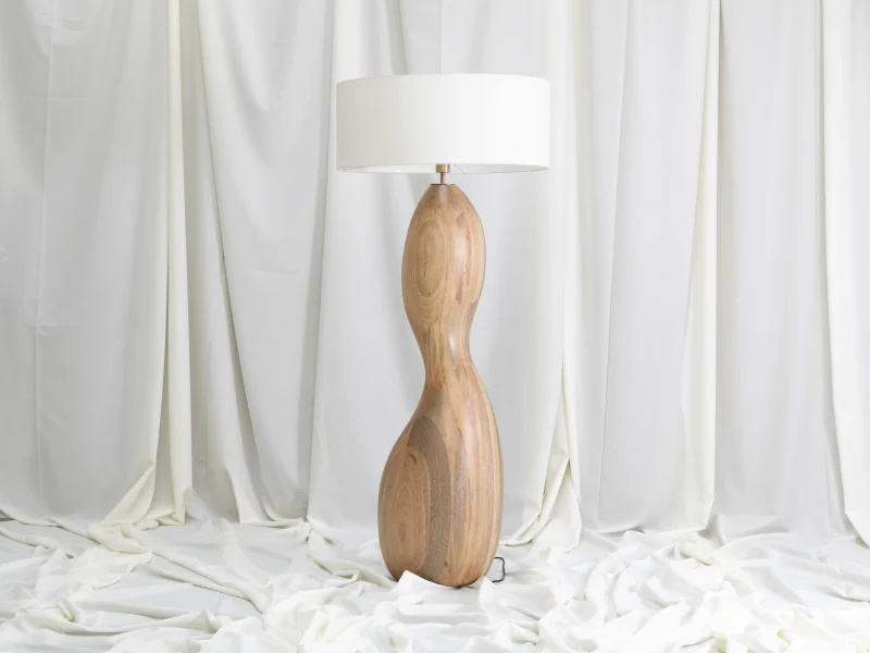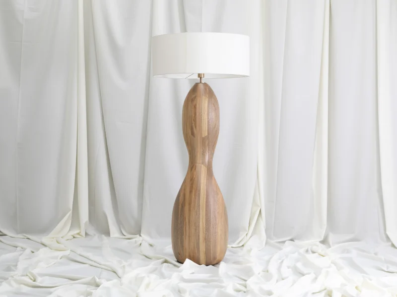 Completely asymmetrical, the Curva Floor Lamp features varying dimensions in its form. The lampshade diameter is 29.5 inches, while the diameter in the lamp’s body varies between 16.5, 10, and 6 inches. Despite its asymmetry, the lamp is completely stable, thanks to its perfectly aligned center and the grounding weight of being made entirely out of solid wood.