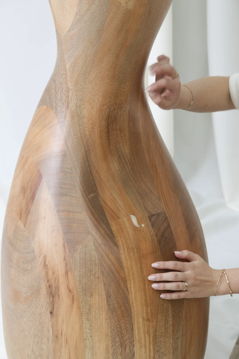 This moment of flow is embodied by carefully hand-sculpted asymmetrical curves in solid fair trade Guarango wood, revealing mesmerizing natural colors and shades. The lamp combines the grounding elements of wood with custom-made bronze hardware for the electrical components, telling a beautiful story of connection with nature and dedicated craftsmanship.