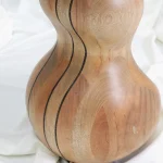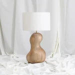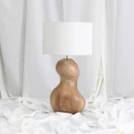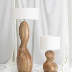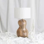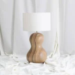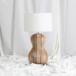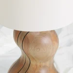 The Curvita table lamp blends coastal influences, with its organic shapes evoking the fluidity of water, boho chic aesthetics, and minimalist design principles. Completely asymmetrical, the lamp boasts varying dimensions in its form. The lampshade diameter is 22 inches, while the diameter in the lamp’s body varies between 15, 11, and 7 inches. Despite its asymmetry, it remains stable with a perfectly aligned center and the grounding weight of being made entirely out of solid wood.