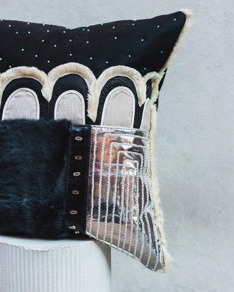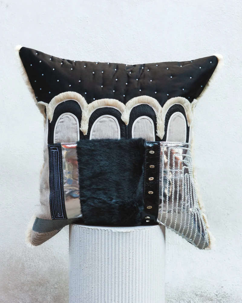Teddy considers his cushions to be textile paintings – often referring to them as his “Alternative Canvas”. Each one takes on a different expression, influenced by the world around him. They are highly decorative, incorporating a variety of hand and machine techniques.