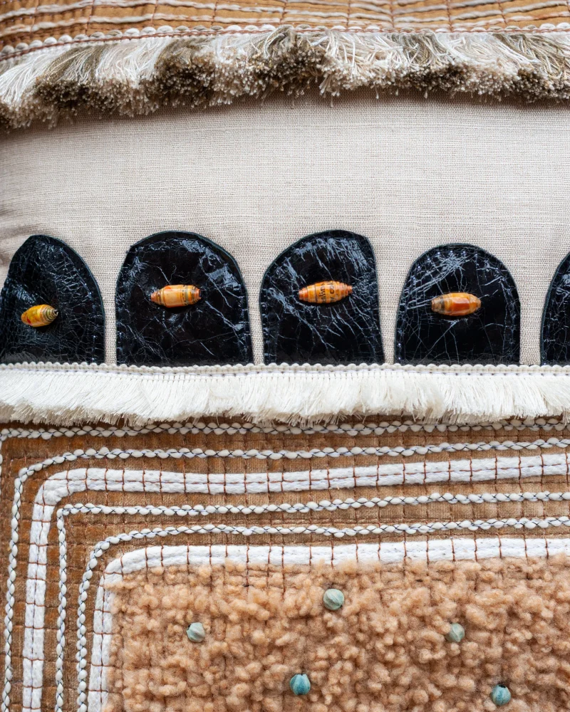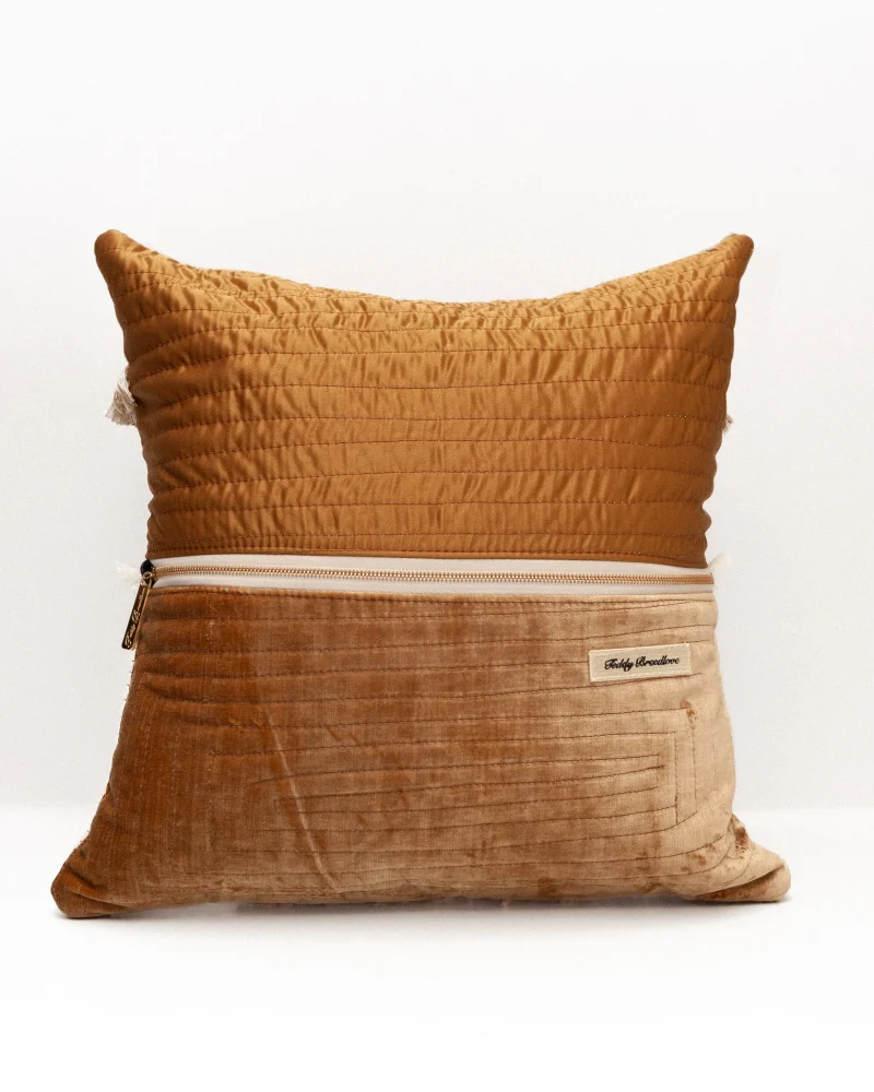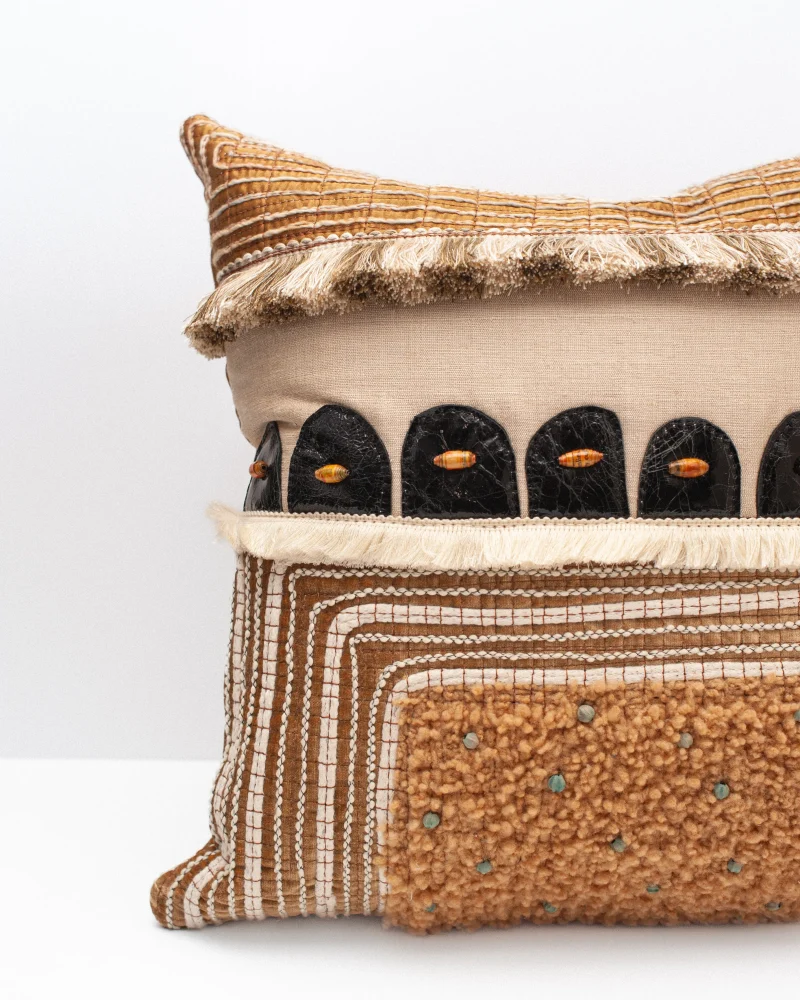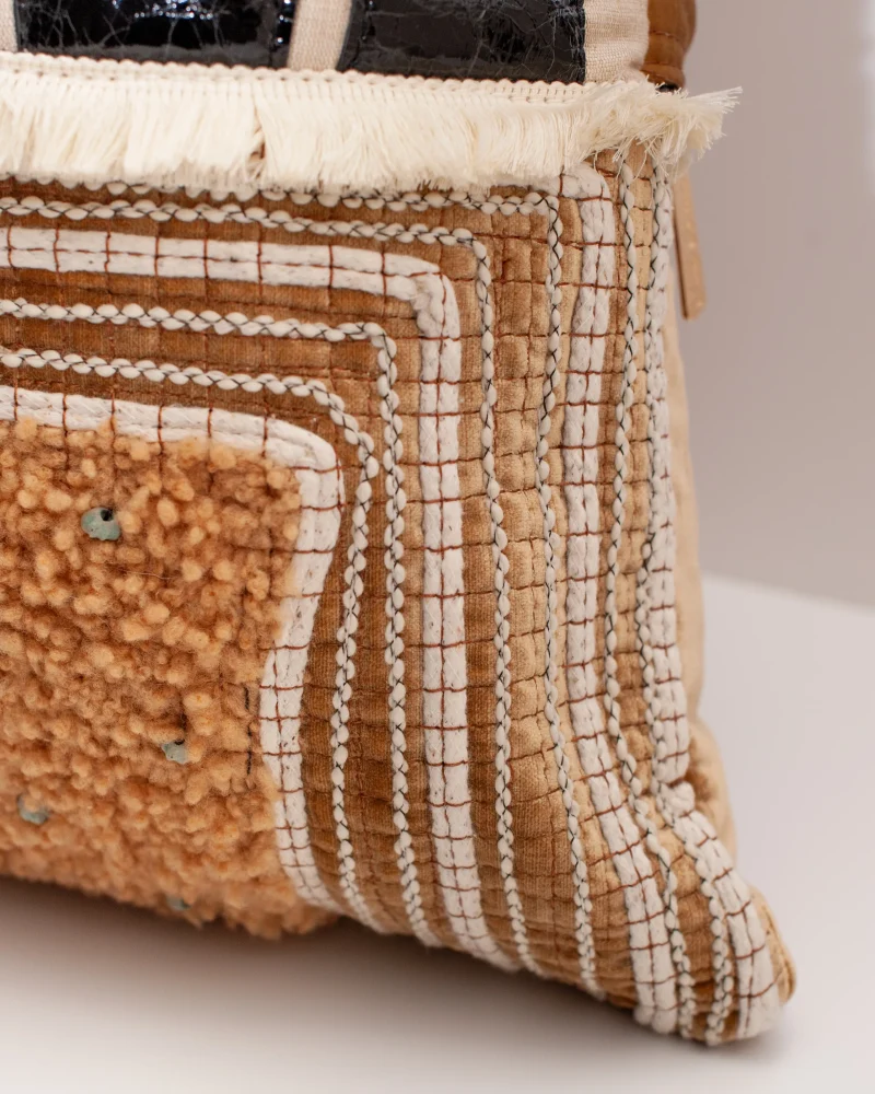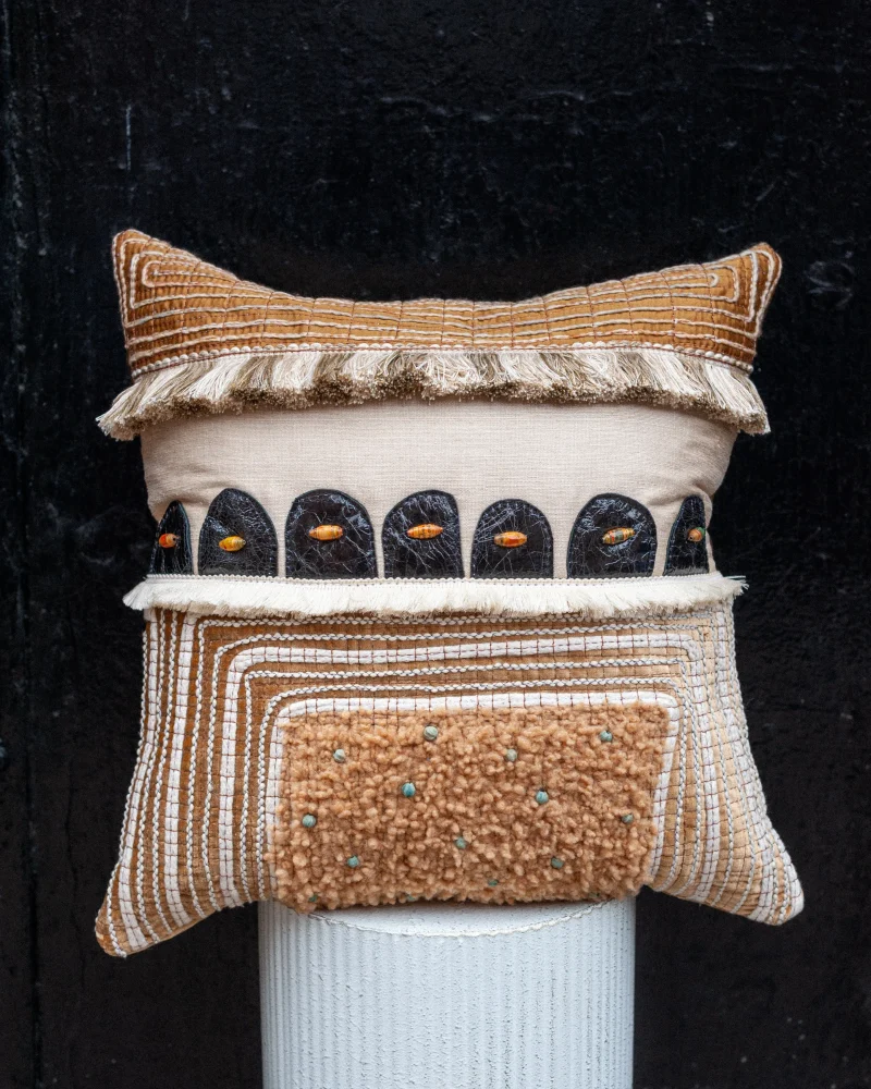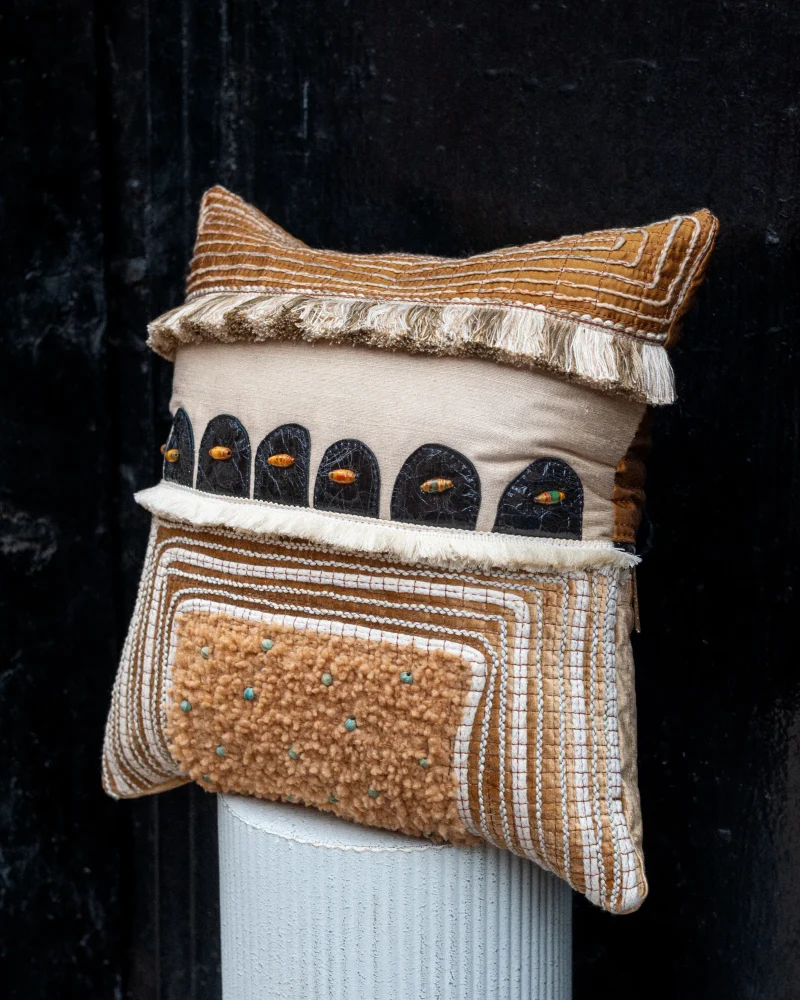 Teddy considers his cushions to be textile paintings – often referring to them as his “Alternative Canvas”. Each one takes on a different expression, influenced by the world around him. They are highly decorative, incorporating a variety of hand and machine techniques.