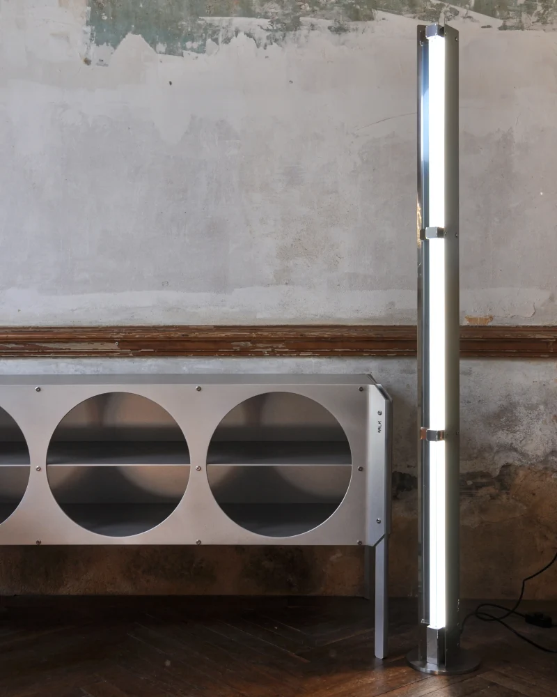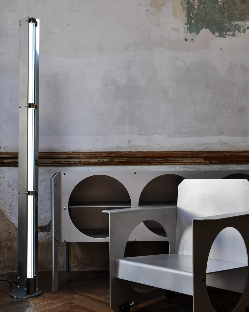 Arthur is inspired by the vibrant nightlife and widespread use of neon lights in the city of Bangkok. After spending seven years immersed in this “neon paradise”, he created his first prototype, the Ne600 Lamp, elevating a common industrial lighting system into a unique decorative object. The lamp features a lighting system encased between metal sheets and acrylic diffusers, resulting in a hybrid design that is both functional and elegant, blending industrial and artisanal elements.