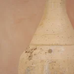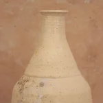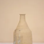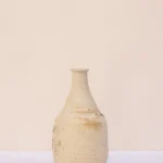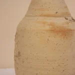 This vase by Volupte Studio exudes a simple yet sophisticated charm with its bottle-like shape and clean lines. The vase features a narrow neck that widens gradually towards the base, creating a smooth, continuous curve. Its surface is characterized by a natural, matte finish in a warm, off-white hue, punctuated by subtle speckles and imperfections that add depth and character. The earthy tones and organic texture evoke a rustic, handcrafted quality. There are faint traces of earthy pigments and natural wear, which further enhance its artisanal appeal. The understated elegance of this vase makes it a versatile piece, perfect for displaying dried flowers or as a standalone decorative object in a minimalist or rustic setting.