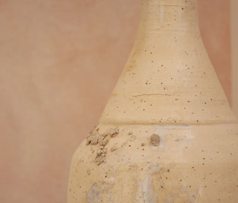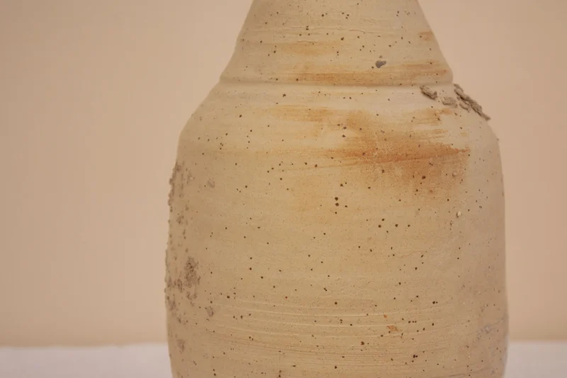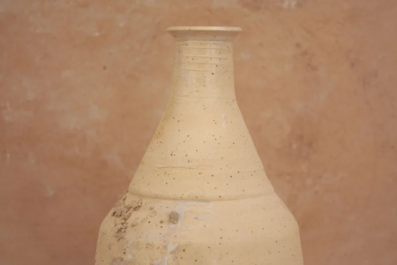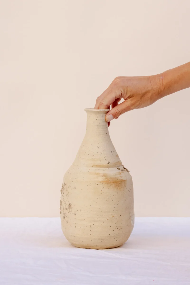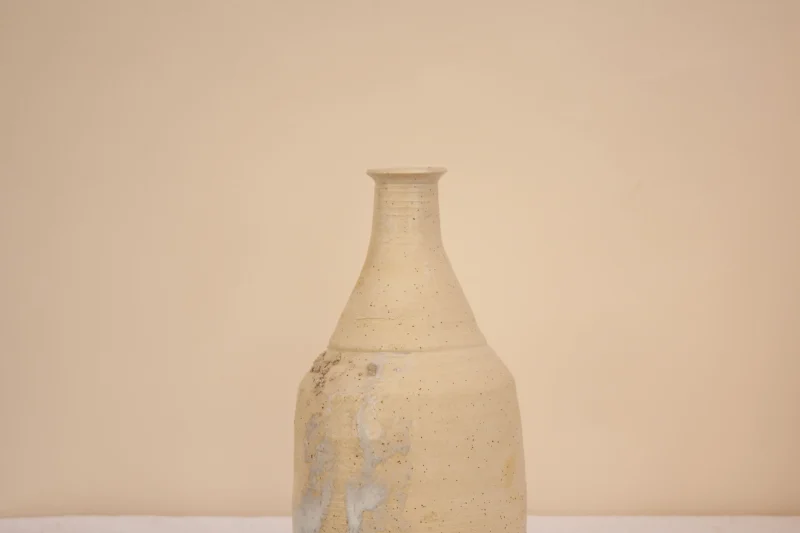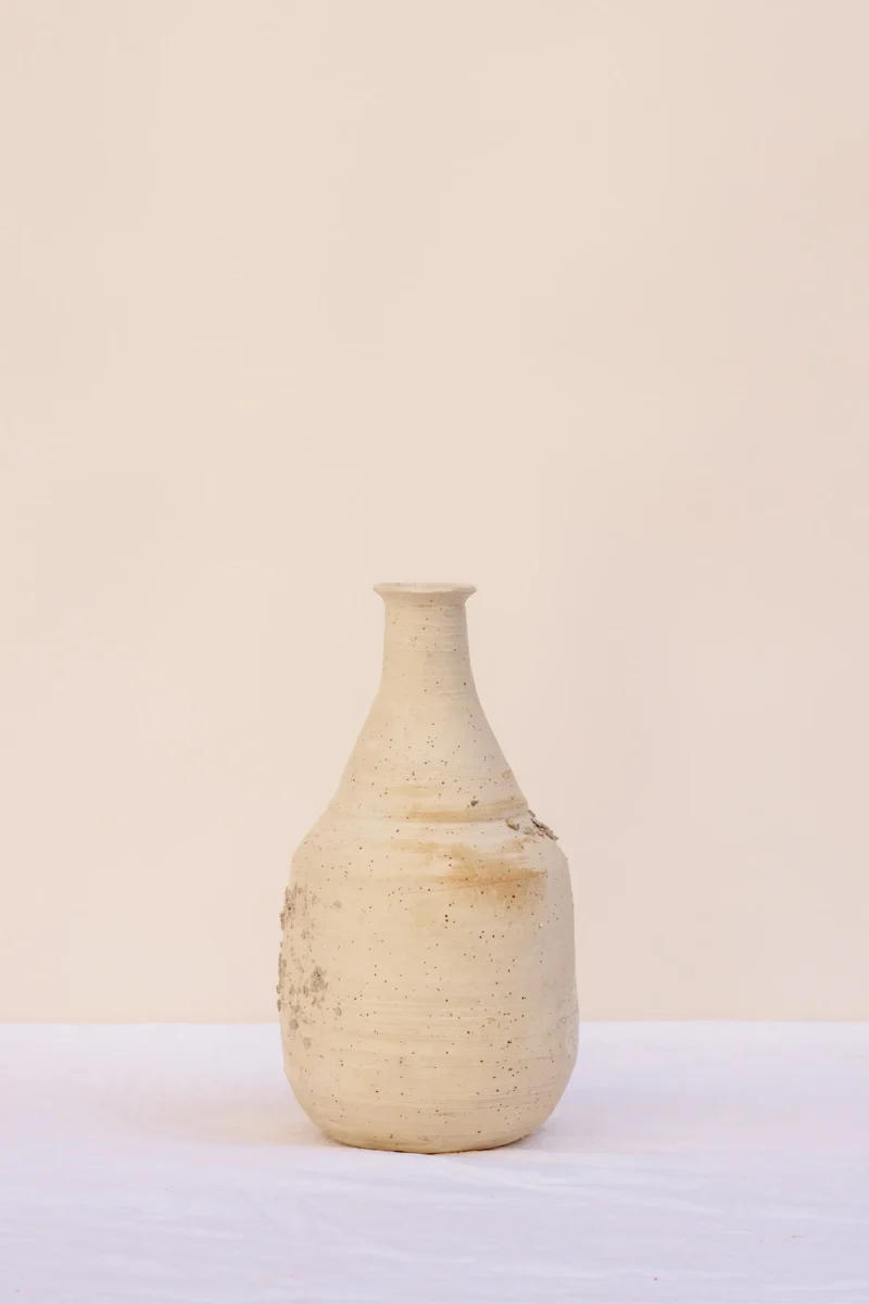 This vase by Volupte Studio exudes a simple yet sophisticated charm with its bottle-like shape and clean lines. The vase features a narrow neck that widens gradually towards the base, creating a smooth, continuous curve. Its surface is characterized by a natural, matte finish in a warm, off-white hue, punctuated by subtle speckles and imperfections that add depth and character. The earthy tones and organic texture evoke a rustic, handcrafted quality. There are faint traces of earthy pigments and natural wear, which further enhance its artisanal appeal. The understated elegance of this vase makes it a versatile piece, perfect for displaying dried flowers or as a standalone decorative object in a minimalist or rustic setting.