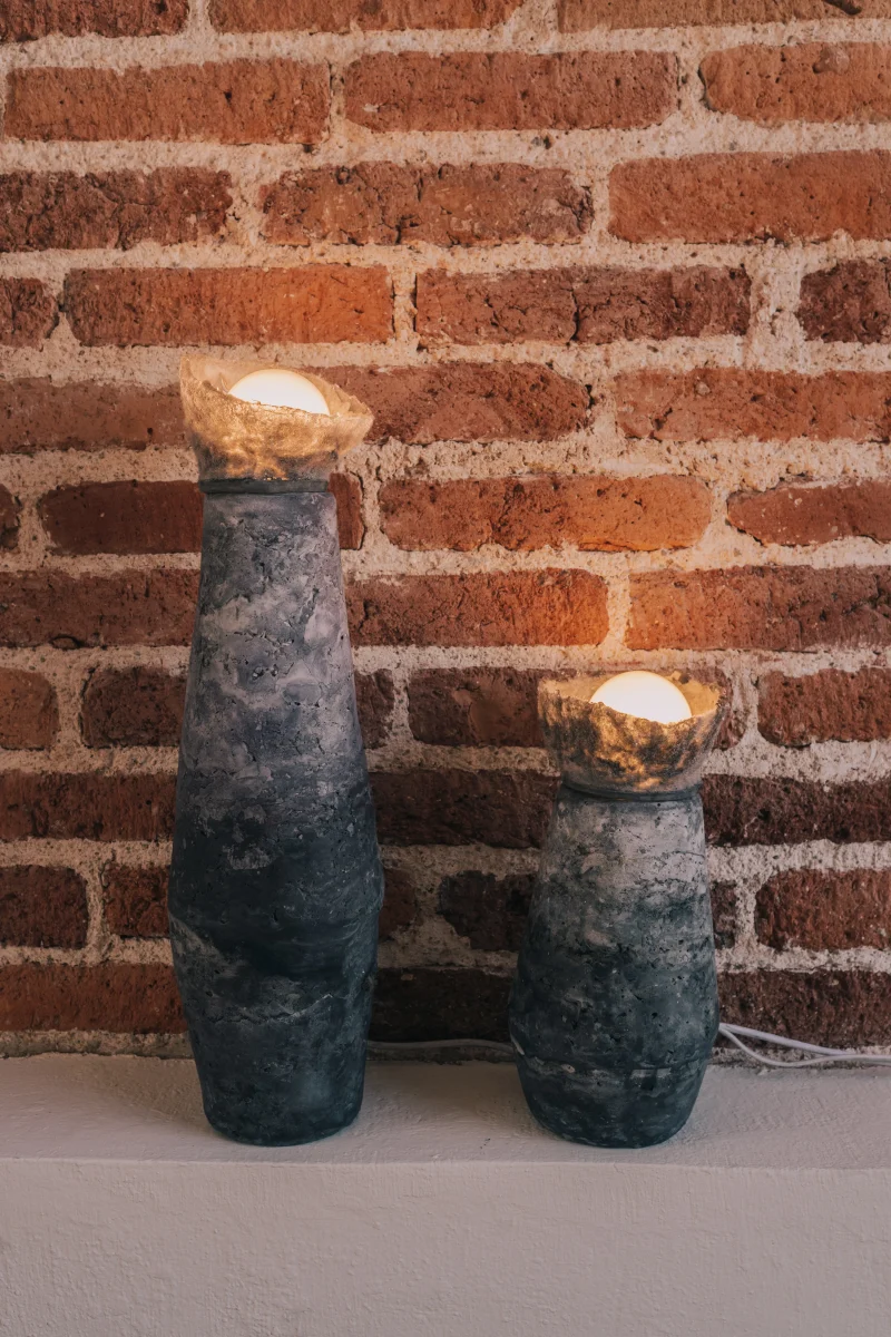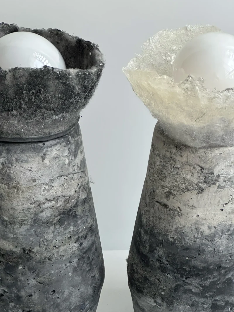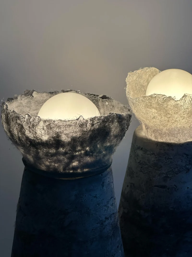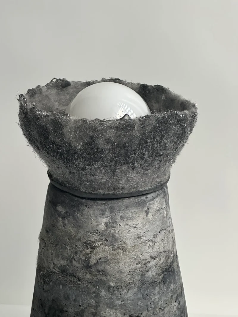 The Smokes are a product of finding catharsis in routine. Each lamp has a twin companion, one light and one dark, and is sized using the same terms as Starbucks. The black-grey gradients are inspired by smoke clouds, to evoke a lightweight, fading feeling. Minimal, balanced compositions highlight the nuances of hand-wrought materials, raw wool, and concrete. Topped with delicate Merino shades, hardened in resin.