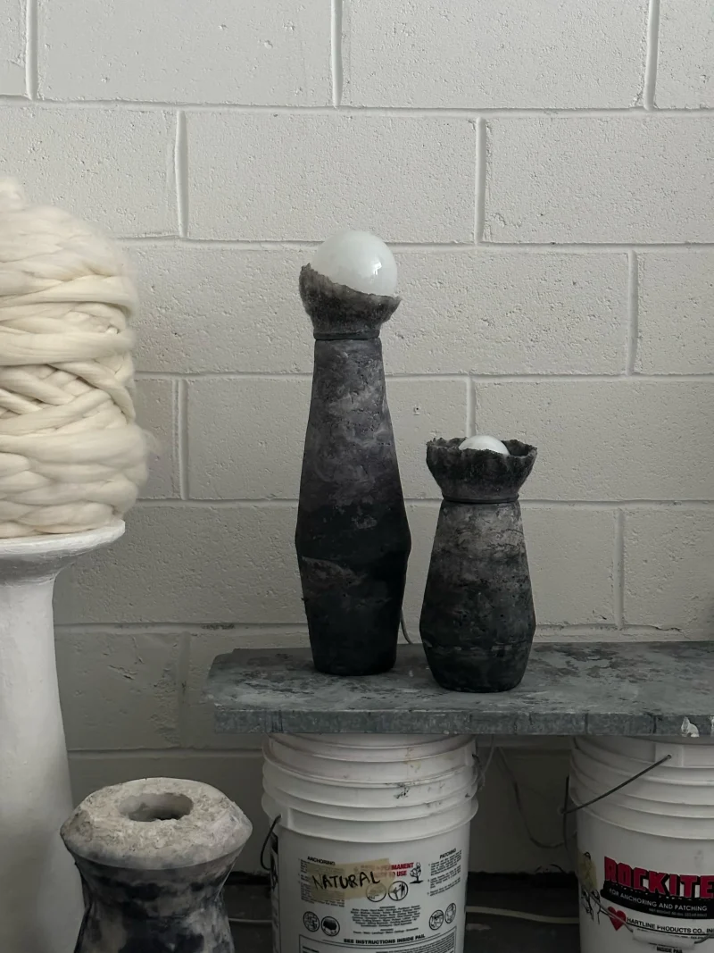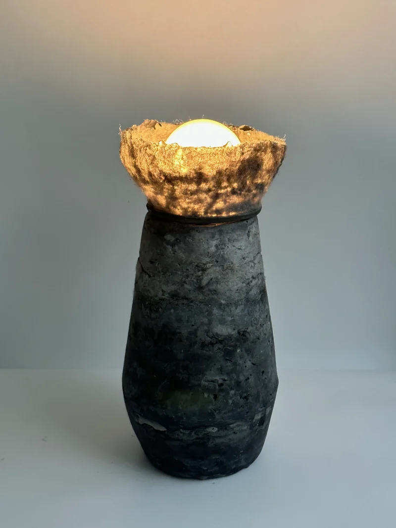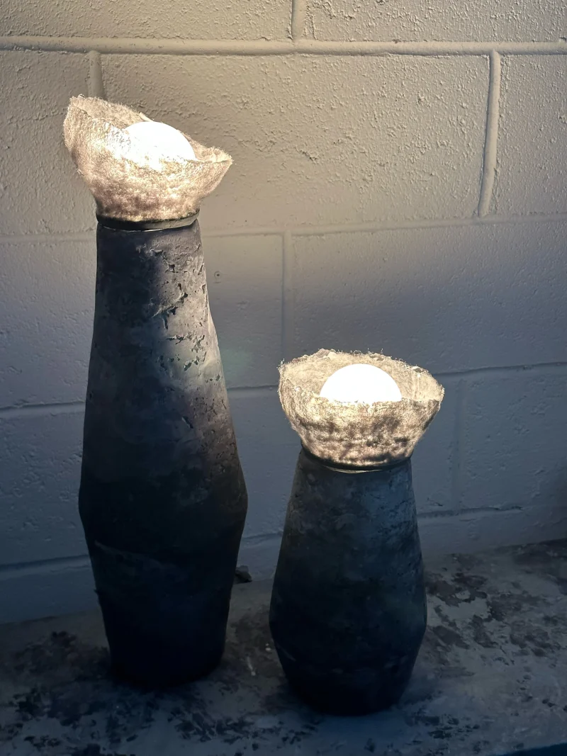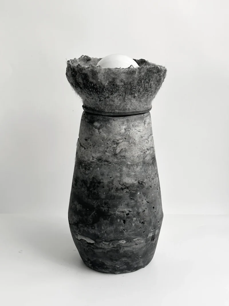 The Smokes are a product of finding catharsis in routine. Each lamp has a twin companion, one light and one dark, and is sized using the same terms as Starbucks. The black-grey gradients are inspired by smoke clouds, to evoke a lightweight, fading feeling. Minimal, balanced compositions highlight the nuances of hand-wrought materials, raw wool, and concrete. Topped with delicate Merino shades, hardened in resin.