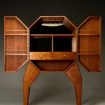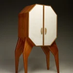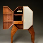 Crafted from rich sapele wood, the Das Bar Cabinet embodies architectural strength and refined elegance. Its angular silhouette rests on sharply faceted legs, giving the piece a sculptural presence. The doors, upholstered in natural horsehair and finished with custom in-house brushed brass pulls, open to reveal a bronze mirror interior that glows with warmth. Designed to hold fine spirits, wine glasses, and barware, it transforms the ritual of entertaining into an art form. More than functional storage, the Das Bar Cabinet is a statement piece that elevates any home with timeless sophistication and distinction.