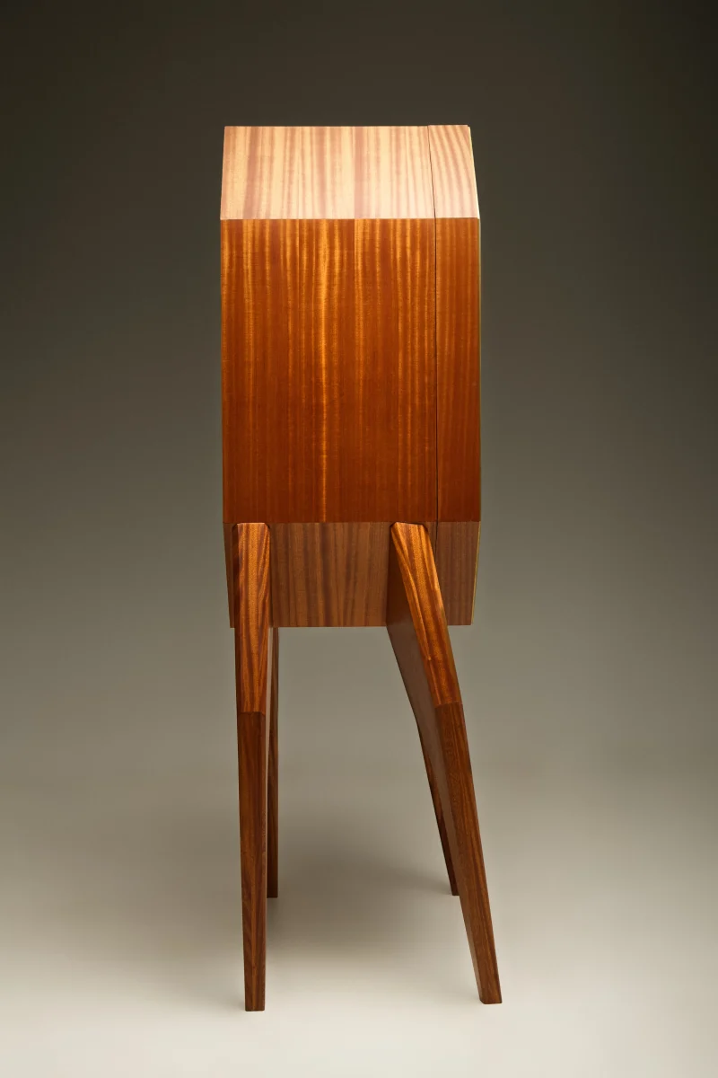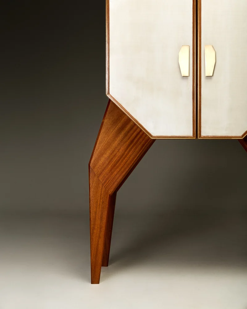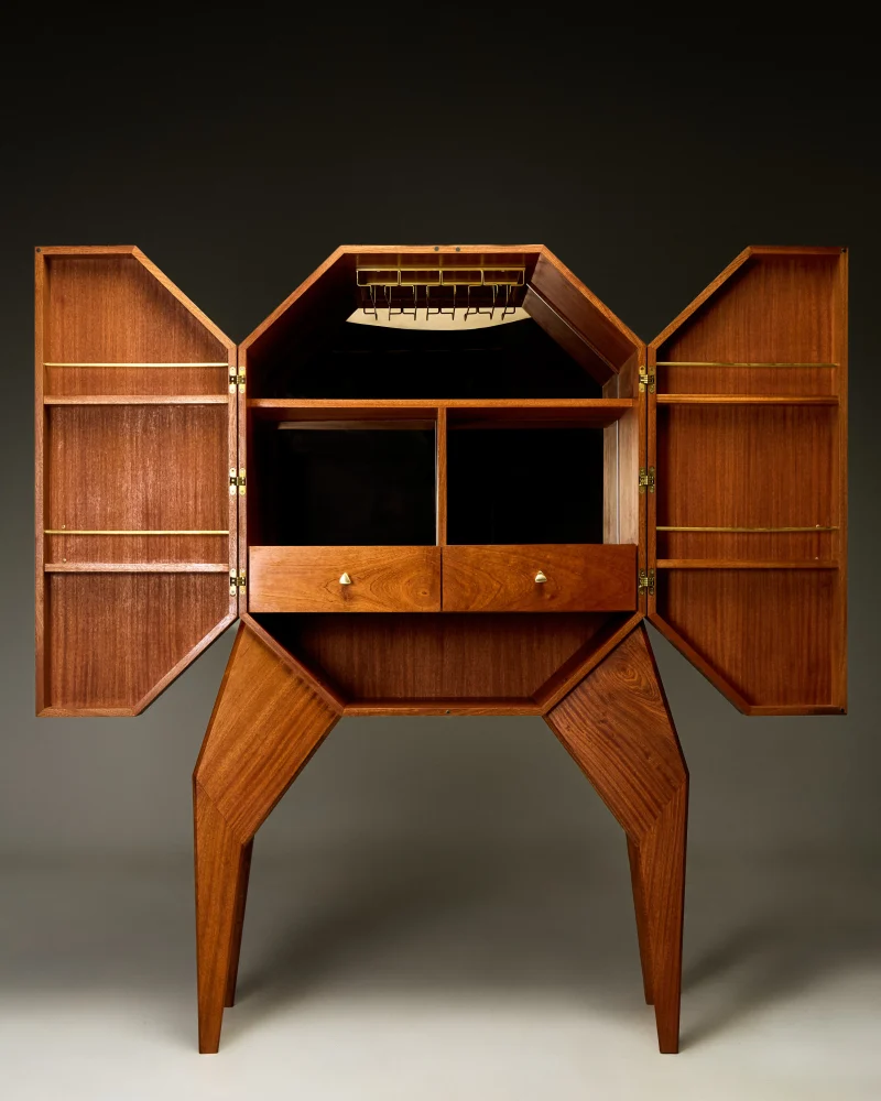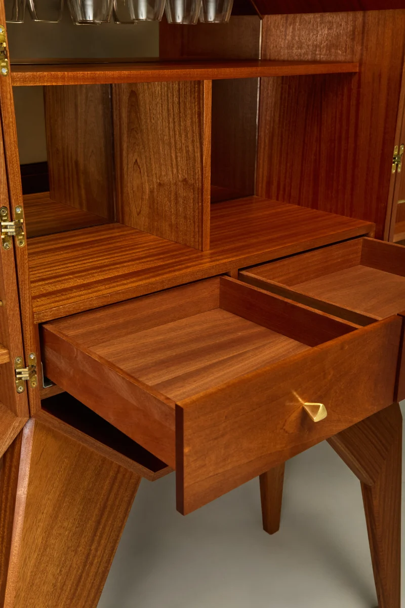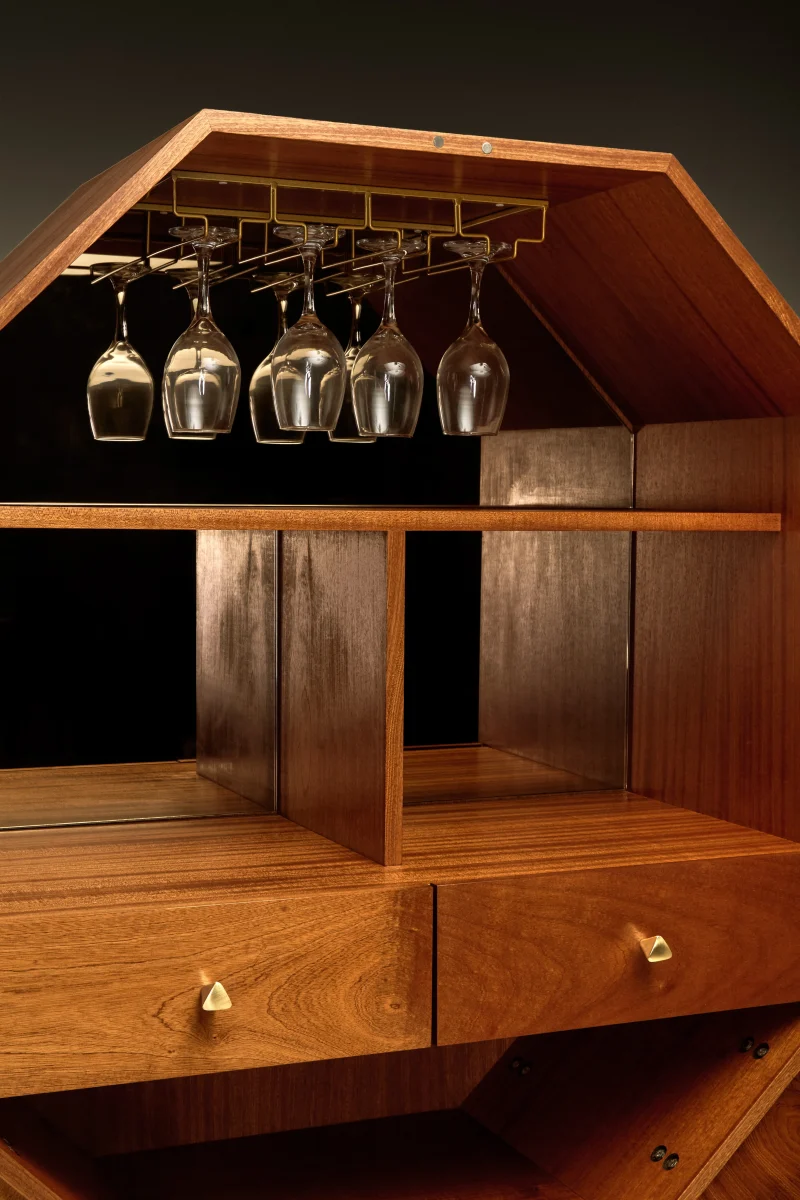 Crafted from rich sapele wood, the Das Bar Cabinet embodies architectural strength and refined elegance. Its angular silhouette rests on sharply faceted legs, giving the piece a sculptural presence. The doors, upholstered in natural horsehair and finished with custom in-house brushed brass pulls, open to reveal a bronze mirror interior that glows with warmth. Designed to hold fine spirits, wine glasses, and barware, it transforms the ritual of entertaining into an art form. More than functional storage, the Das Bar Cabinet is a statement piece that elevates any home with timeless sophistication and distinction.