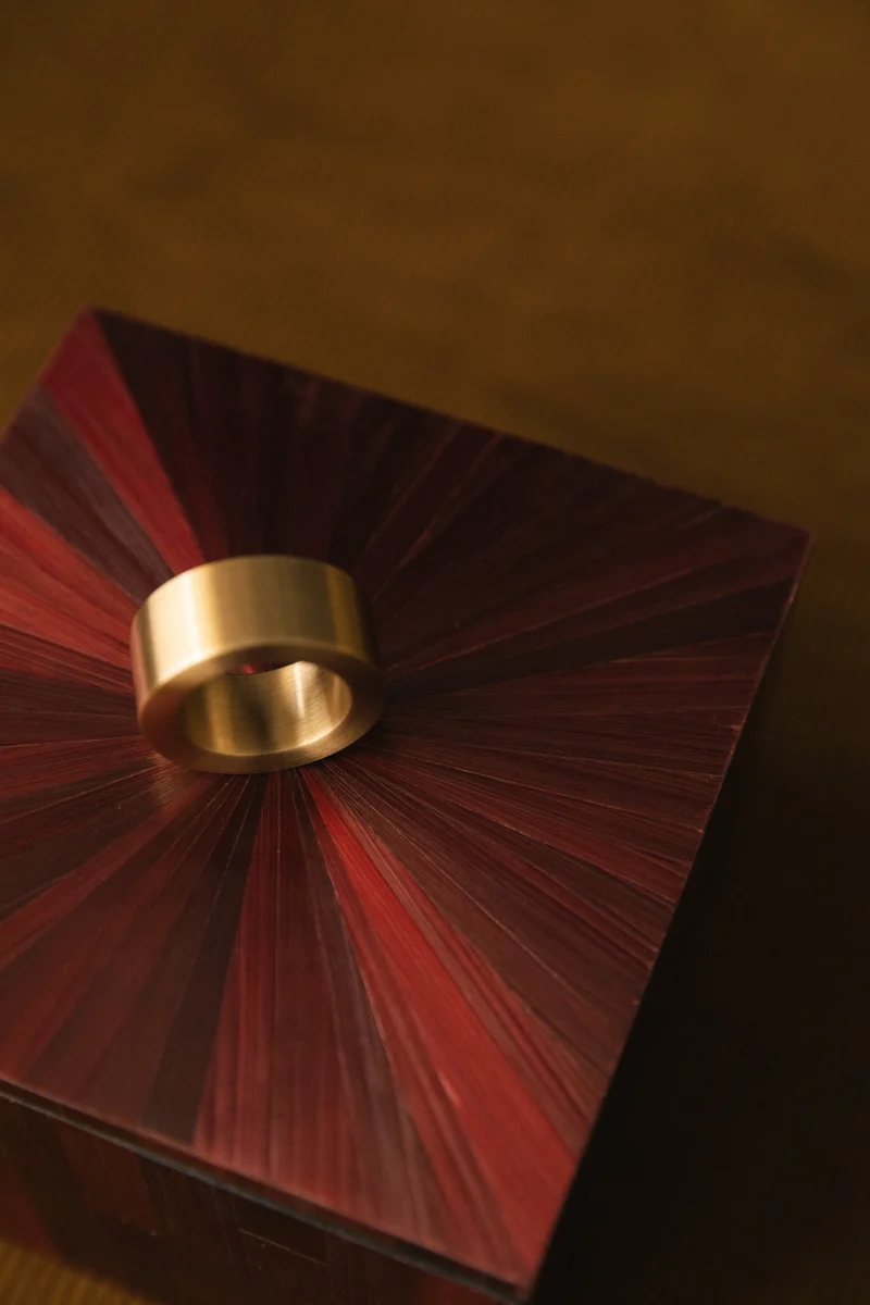 MATERIALS: MDF, painted rye straw, brass.