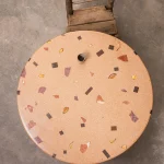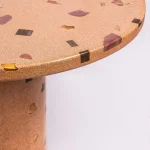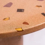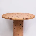 The Dendê Dining Table incorporates remnants of ceramic tile, marble, glass, and jatobá wood flooring. The base is steel with electrostatic paint.