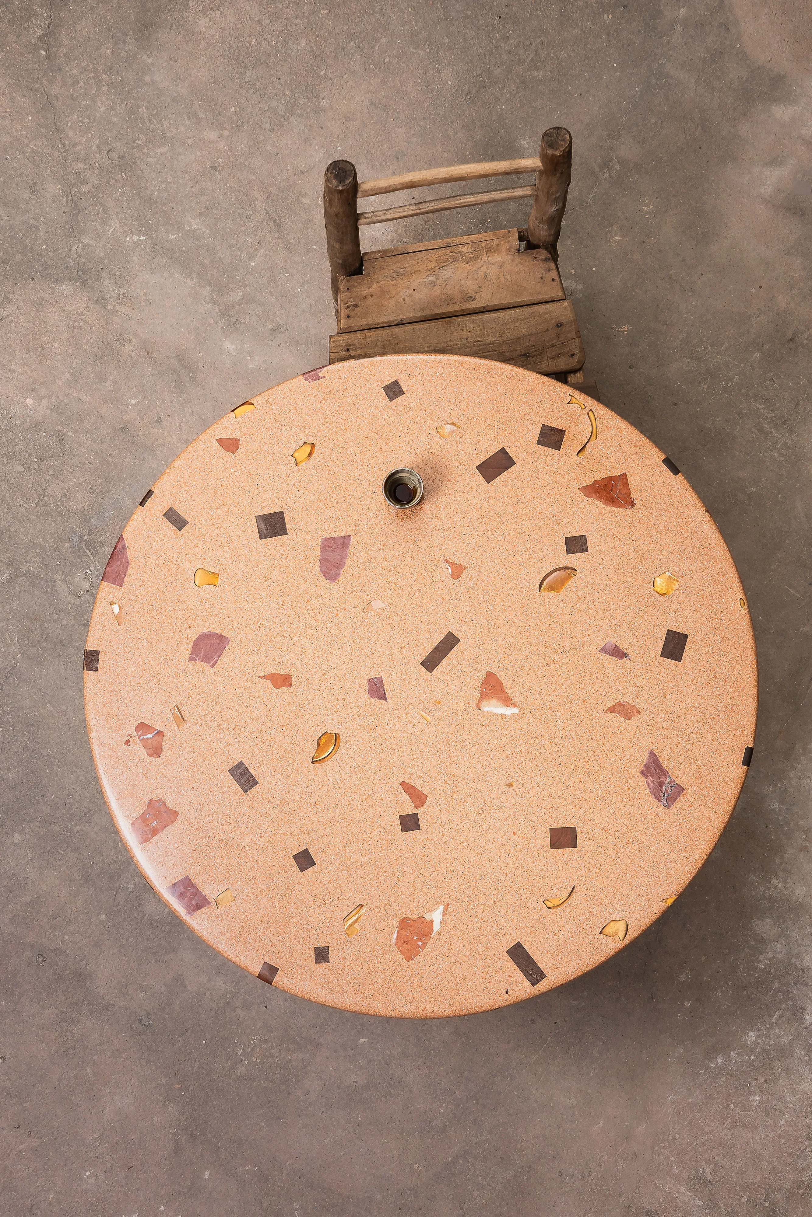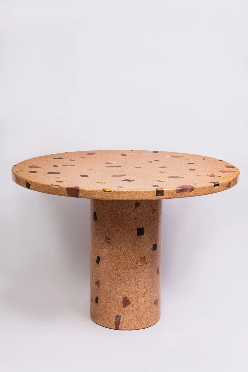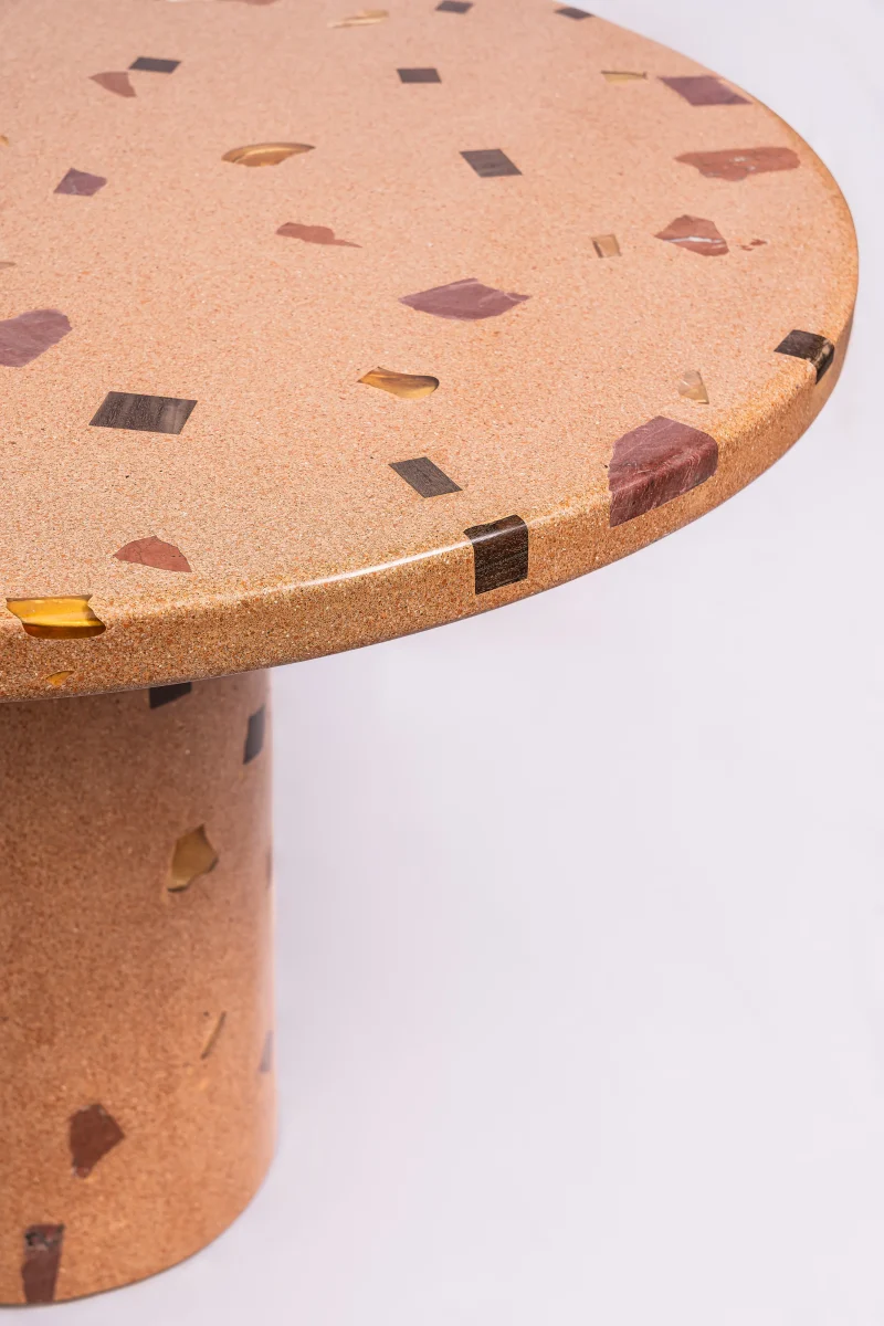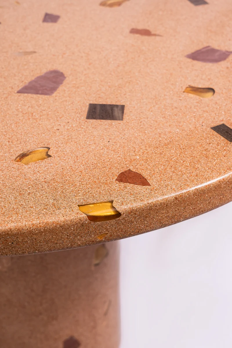 The Dendê Dining Table incorporates remnants of ceramic tile, marble, glass, and jatobá wood flooring. The base is steel with electrostatic paint.