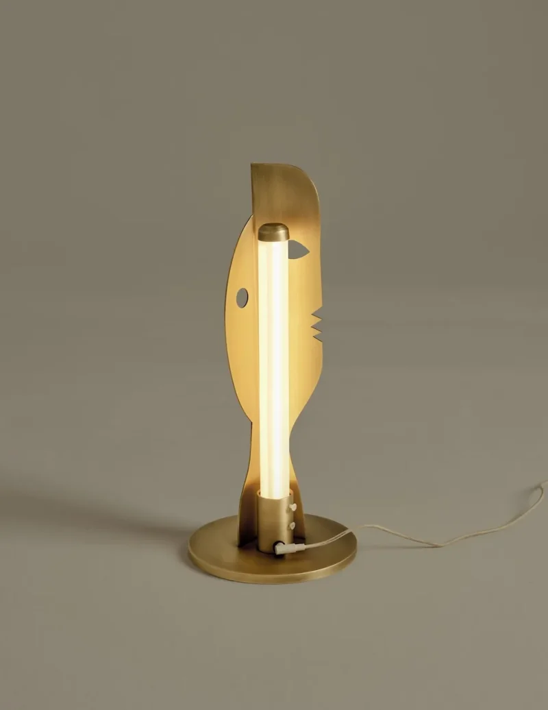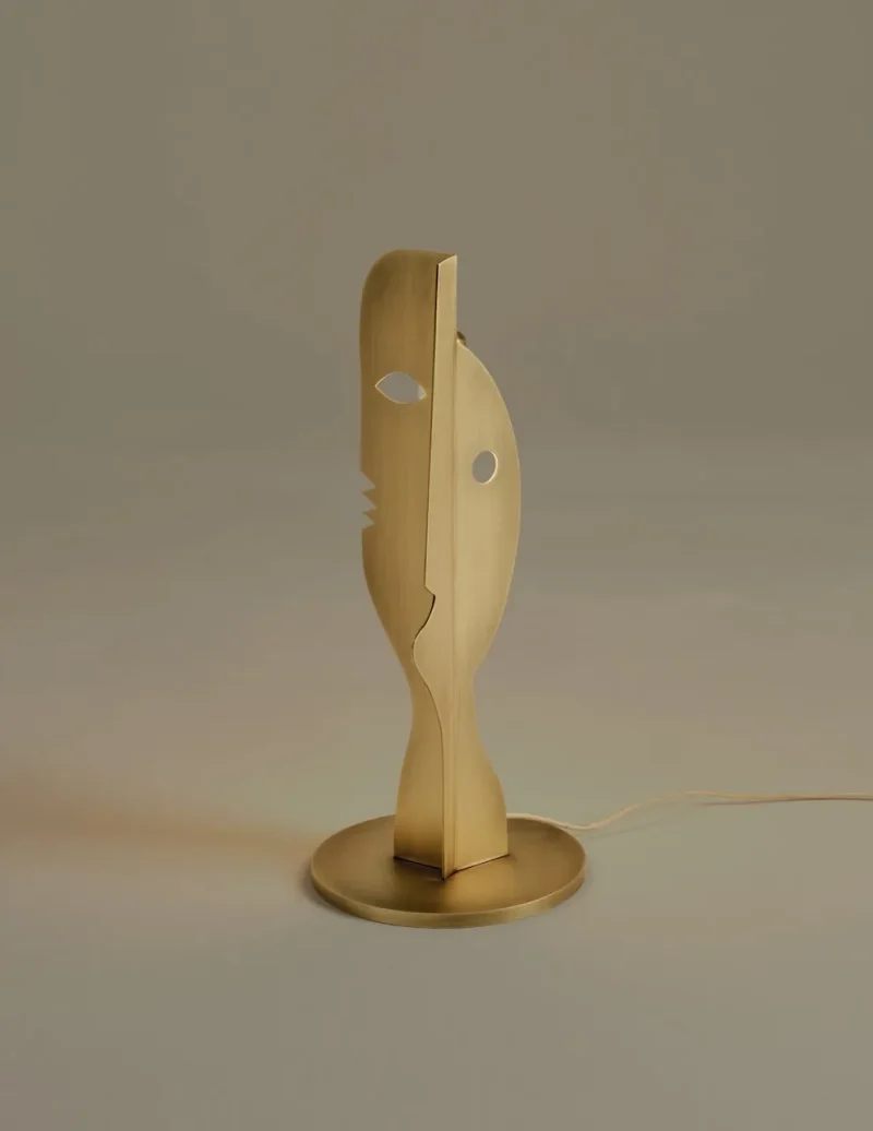 Deramo Lamp finds its inspiration in Sophie Taeuber-Arp’s Stag King, a Dada-era puppet theatre where figures took shape within a liminal aesthetic between human and object. Formed in gold-finished metal, light flows through the eyes of the figure, animating the face with a quiet expression. When off, it exists as sculpture; when illuminated, it performs as light.