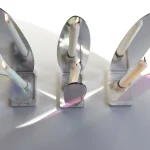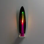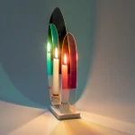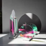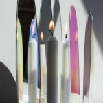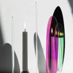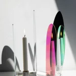 A collection of candleholders displays infinitely mirrored flames trailing off into the colorful abyss. Paying homage to the primordial element, Onnda Flame places fire at the heart of otherworldly objects. The candle holder has a concentric design, thereby casting colorful shadows in the ambient space. The shades, shadows, and reflections are ever-changing depending on the time of day, the light source, and the viewpoint of the observer.
