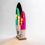 The dichroic acrylic material creates fascinating light effects and through its composition depending on the angle from which it is viewed, it changes color and creates a whole spectrum of lights, shadows, and reflections. The blaze option (blue-orange) incorporates a filter that displays these two colors. The object’s base is handcast in Jesmonite, and each piece is unique. Jesmonite is a water-based, eco-friendly mineral resin that mimics stone.