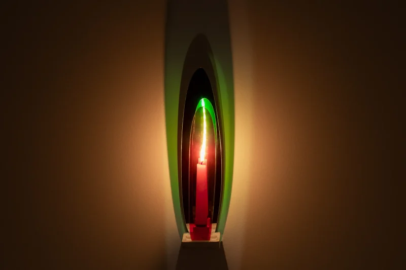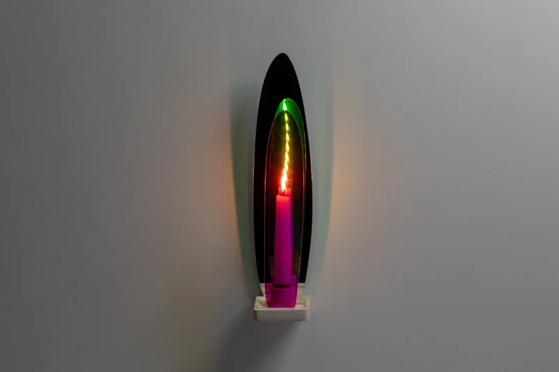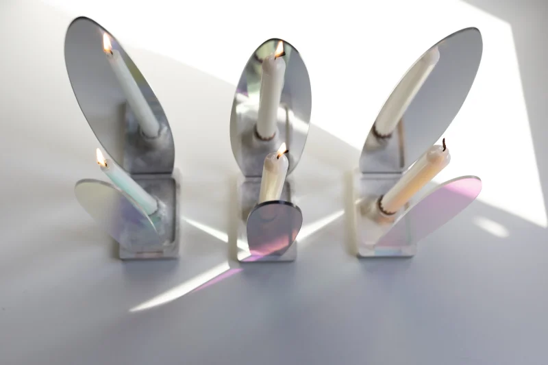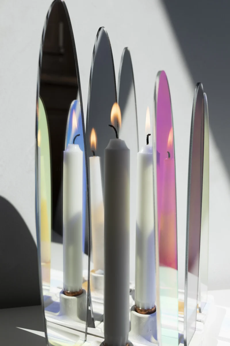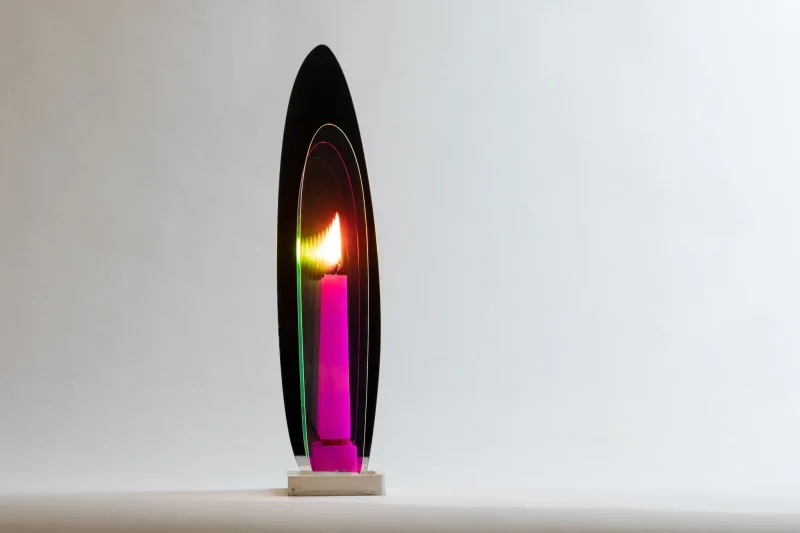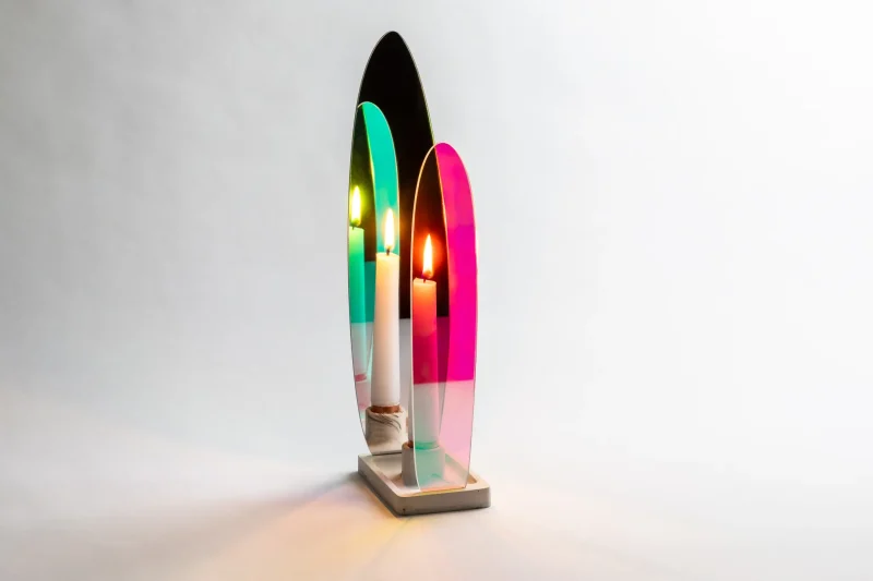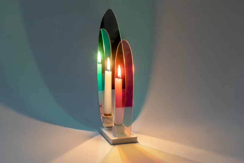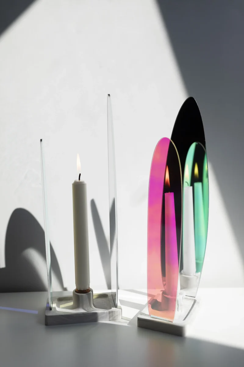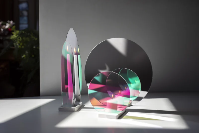 A collection of candleholders displays infinitely mirrored flames trailing off into the colorful abyss. Paying homage to the primordial element, Onnda Flame places fire at the heart of otherworldly objects. The candle holder has a concentric design, thereby casting colorful shadows in the ambient space. The shades, shadows, and reflections are ever-changing depending on the time of day, the light source, and the viewpoint of the observer.