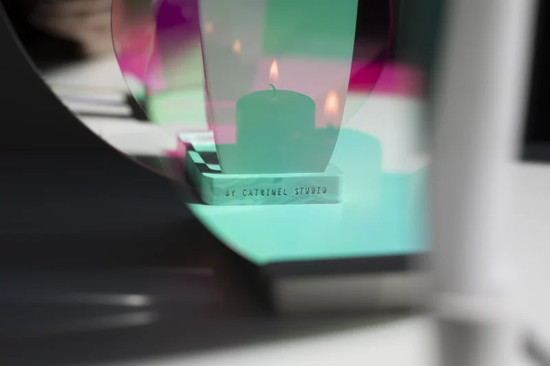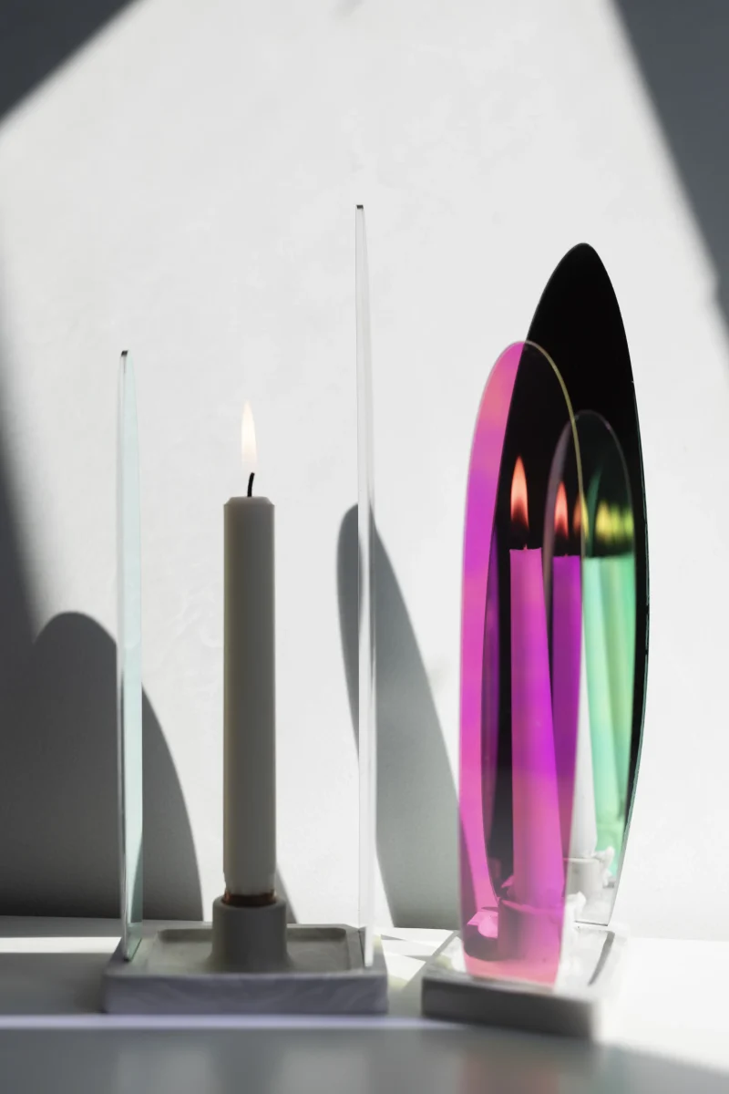 The candleholder displays a mesmerizing spectacle of ever-changing colorful shadows. Its form is inspired by the candle flame shape—asymmetrical, ever-changing, yet so alive. The candle holder is designed for 20 mm diameter stick candles.