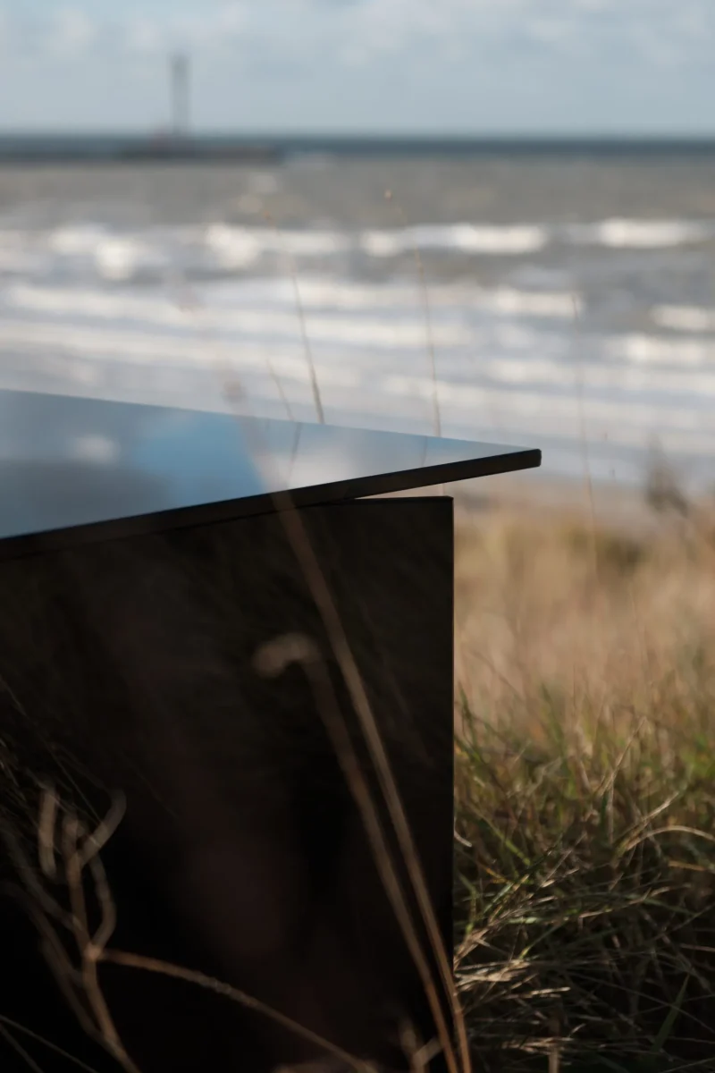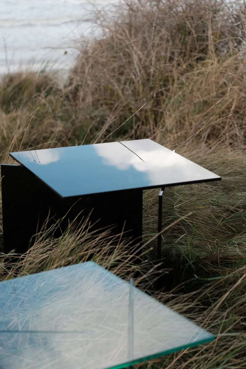 “Diffraction” is an art object/ side table inspired by the taboo that humanity is creating in response to the technological revolution. One way this is manifesting itself is through our position and point of view, which is getting lower and lower, to a point that we are longer no looking up. This art object explores this dialogue. By reflecting and refracting the light, it invites the viewer to take a moment for themselves away from technology and contemplate.