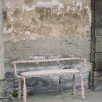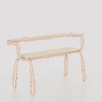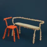 Each piece consists of a tubular steel structure—a simple, recognizable form—dressed in a hand-sewn, spiky textile cover that transforms it into a creature.