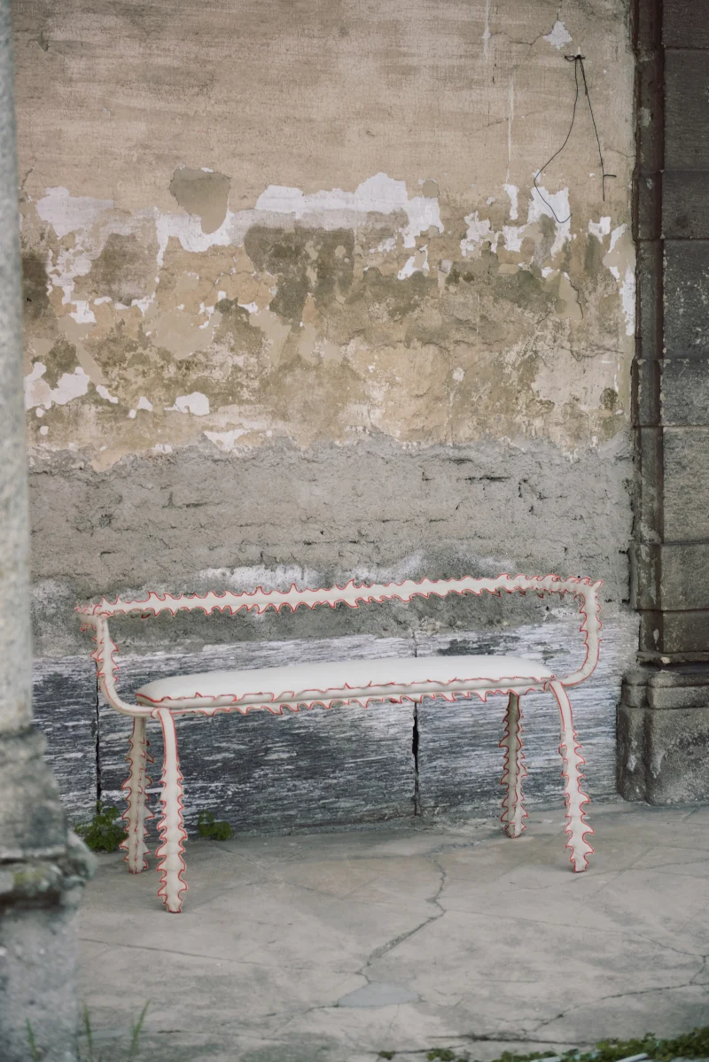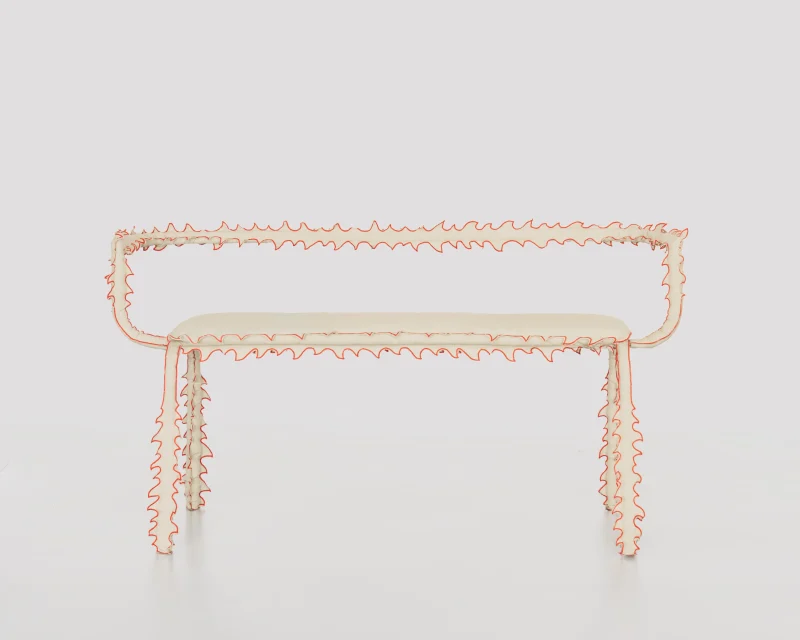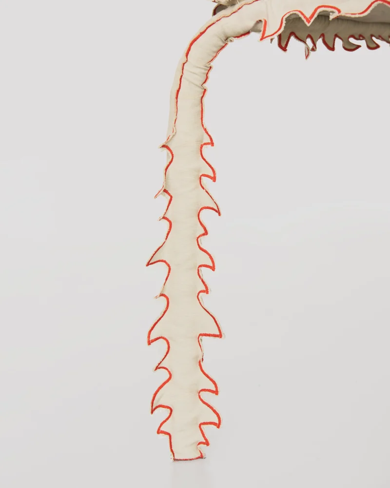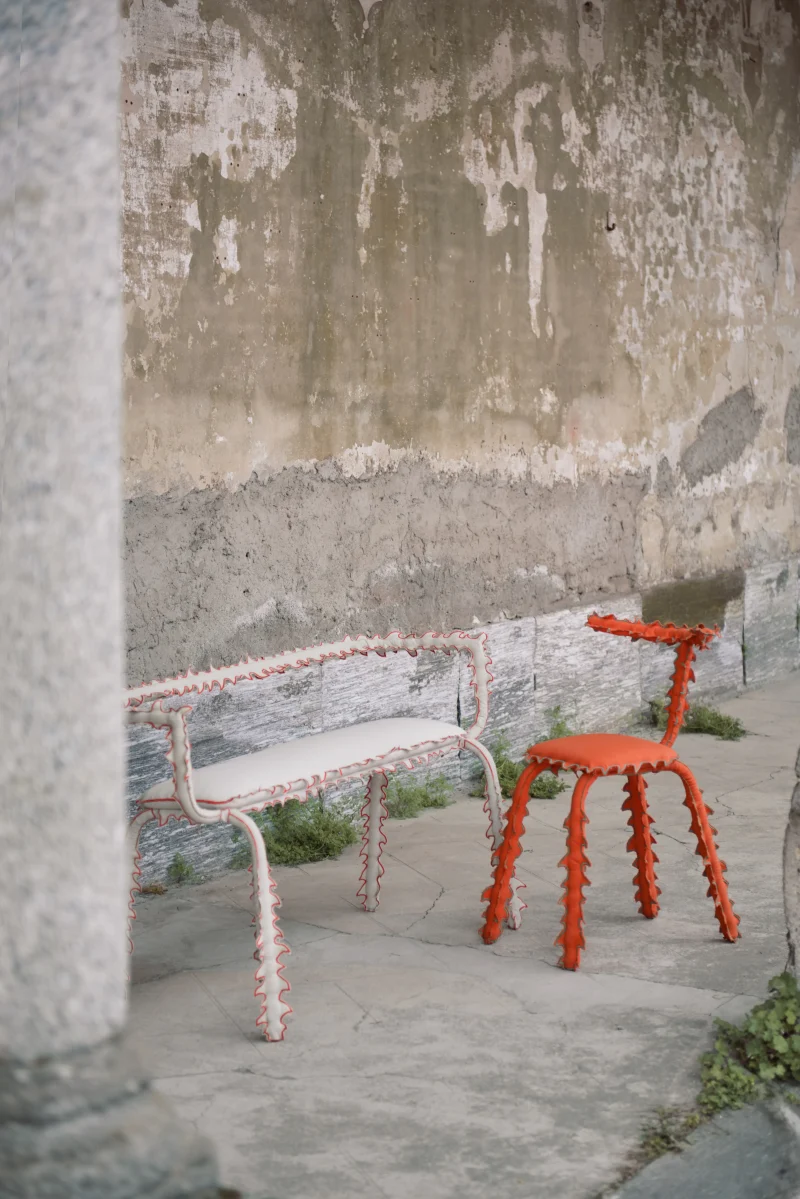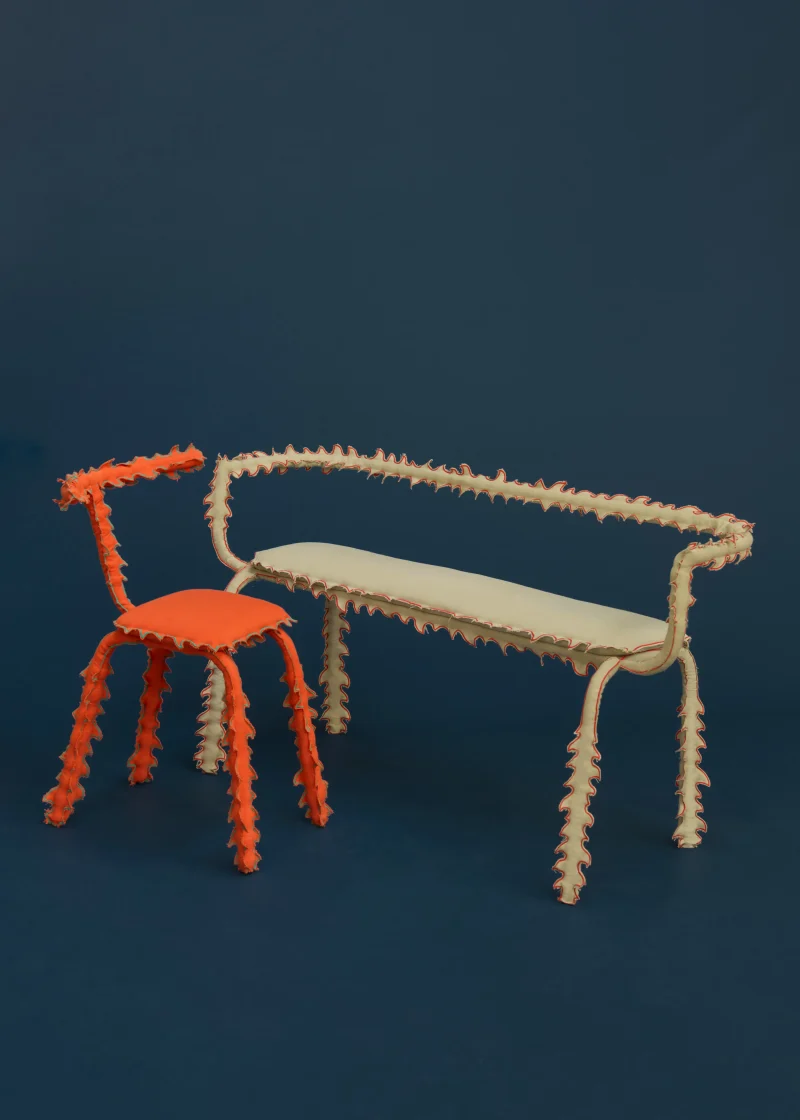 Each piece consists of a tubular steel structure—a simple, recognizable form—dressed in a hand-sewn, spiky textile cover that transforms it into a creature.