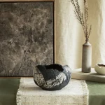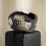 The raw edge has been created by adding intentional breakage before the first firing. Each piece undergoes two firings; the first is a bisque where the piece gets heated to cone 04 (1950 ° F / 1100° C). The second is a glaze firing in which the piece is fired to cone 5 (2160 ° F / 1180° C) to reach vitrification, creating an airtight seal, making this vessel suitable for holding water, inspired by charred wood and techniques used from traditional Hakeme ceramics, originating in Korea, later introduced to Japan in the 17th century. This vessel is intended for decorative use only and can be styled on its own as a decorative object, with dried florals, or with a Japanese Kenzan for an Ikebana arrangement.