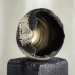 The Distressed Onyx Form by Alex Roby is a wheel-thrown ceramic piece made from black stoneware with additional white stoneware slip decoration. The surface has been left raw to highlight the beauty of the clay body, featuring a subtle cracked texture from the application of sodium silicate during the throwing process. It is lined with a bronze glaze, creating juxtaposition from the rugged surface. Before the walls of the piece were pushed out, a tool was used repeatedly along the sides to make multiple tiny horizontal and diagonal lines, which enhanced the unique cracked texture.