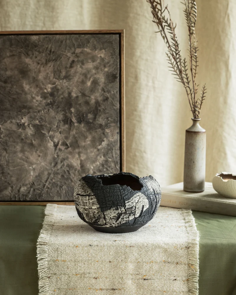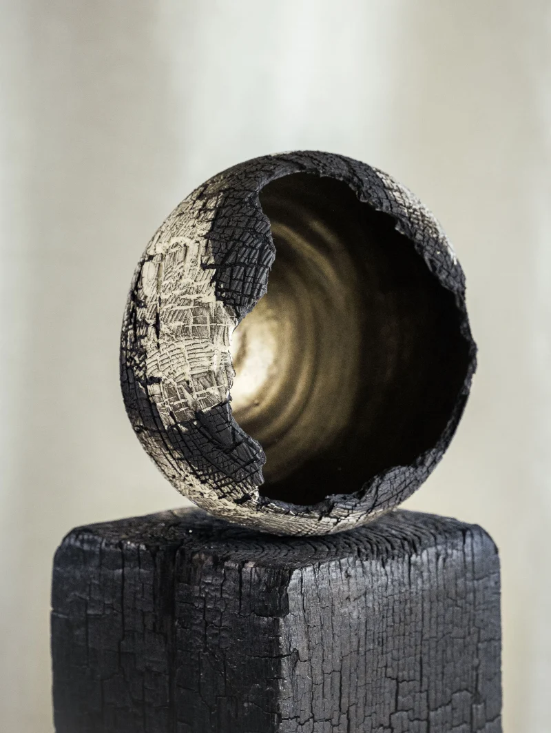 The raw edge has been created by adding intentional breakage before the first firing. Each piece undergoes two firings; the first is a bisque where the piece gets heated to cone 04 (1950 ° F / 1100° C). The second is a glaze firing in which the piece is fired to cone 5 (2160 ° F / 1180° C) to reach vitrification, creating an airtight seal, making this vessel suitable for holding water, inspired by charred wood and techniques used from traditional Hakeme ceramics, originating in Korea, later introduced to Japan in the 17th century. This vessel is intended for decorative use only and can be styled on its own as a decorative object, with dried florals, or with a Japanese Kenzan for an Ikebana arrangement.