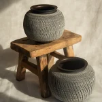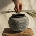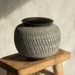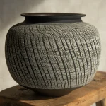 The Distressed Onyx Collection is a series of hand-thrown vessels made from black stoneware with an elegant surface texture. This intricate process begins with a cylinder thrown on the wheel from tan clay. The surface layer is dried with a heat gun and the white slip is applied. The slip is dried with heat and the sodium silicate is applied. After undergoing another round of heat to the surface, the vessel is then shaped from the inside using one hand to push the walls out. This process breaks the dried layer of clay creating a delicate cracked texture over the body of the piece, revealing the tan clay beneath the white. After being thrown on the wheel the vessel undergoes more intentional shaping by hand to create more dimension within the piece. The vessel is trimmed and undergoes two rounds of firing before completion.