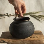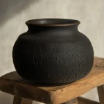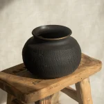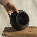 This piece is made from a black stoneware with an elegant surface texture. This intricate process begins with a cylinder thrown on the wheel from black clay. The surface layer is dried with a heat gun and then sodium silicate is applied. After undergoing another round of heat to the surface, the vessel is then shaped from the inside using one hand to push the walls out. This process breaks the dried layer of clay creating a delicate cracked texture over the body of the piece. The vessel is trimmed and undergoes two rounds of firing before completion.