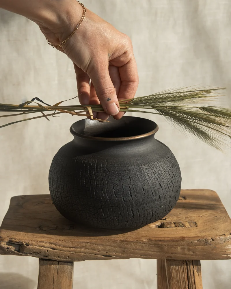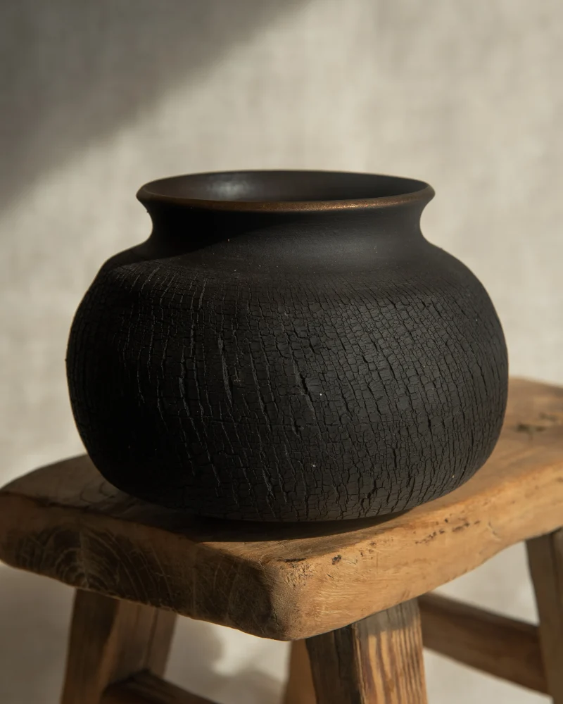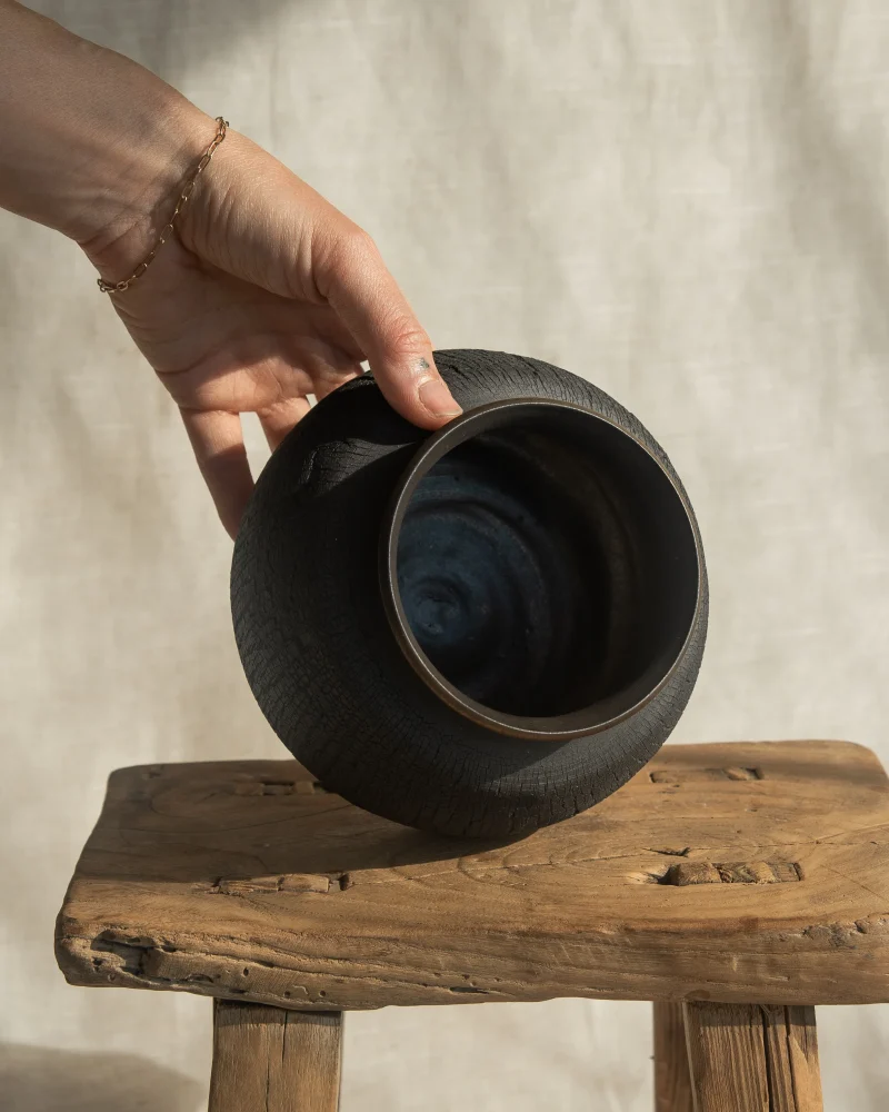 This piece is made from a black stoneware with an elegant surface texture. This intricate process begins with a cylinder thrown on the wheel from black clay. The surface layer is dried with a heat gun and then sodium silicate is applied. After undergoing another round of heat to the surface, the vessel is then shaped from the inside using one hand to push the walls out. This process breaks the dried layer of clay creating a delicate cracked texture over the body of the piece. The vessel is trimmed and undergoes two rounds of firing before completion.