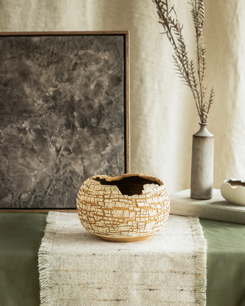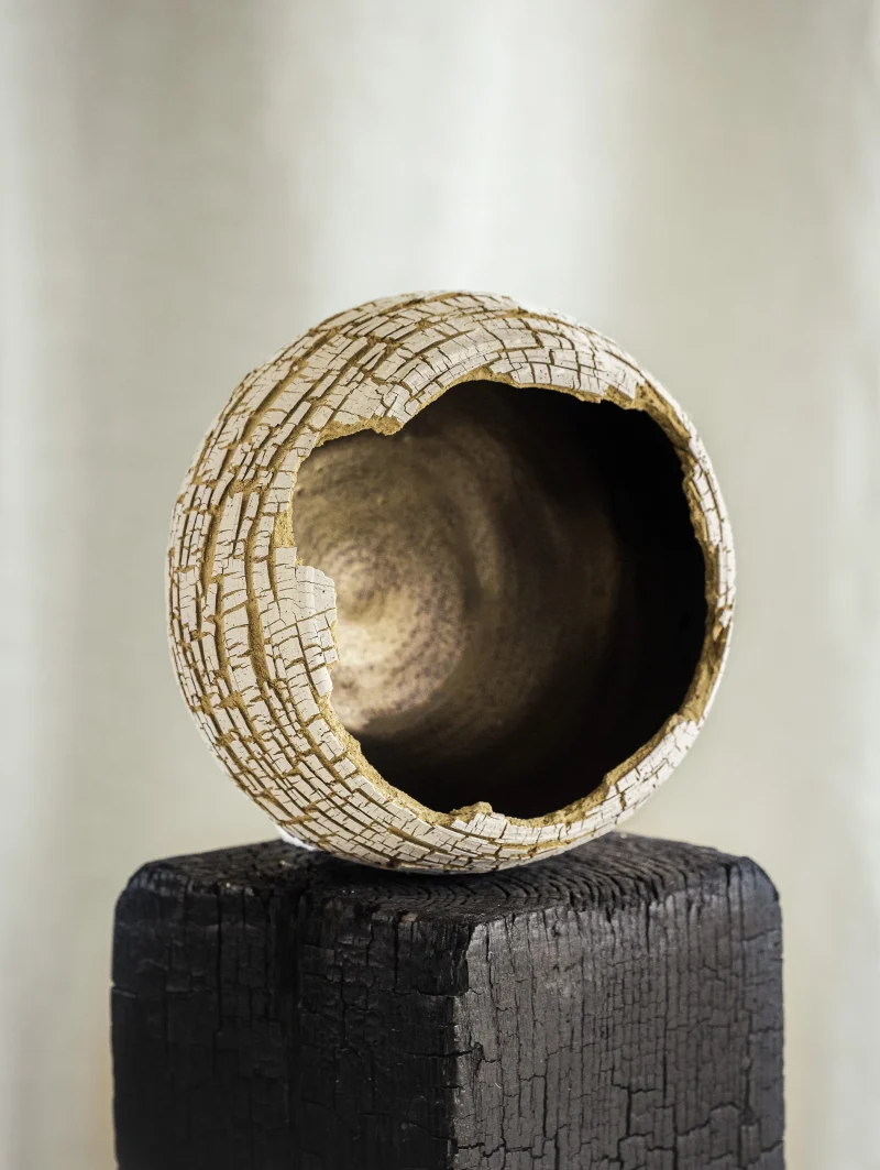 The Distressed Sandstone Form by Alex Roby is a wheel-thrown ceramic piece made from tan stoneware with additional white stoneware slip decoration. The surface has been left raw to highlight the beauty of the clay body, featuring a subtle cracked texture from the application of sodium silicate during the throwing process. It is lined with a bronze glaze, creating juxtaposition from the rugged surface. Before the walls of the piece were pushed out, a tool was used repeatedly along the sides to make multiple tiny horizontal and diagonal lines, enhancing the unique cracked texture. The raw edge has been created by adding intentional breakage before the first firing. Each piece undergoes two firings. The first is a bisque where the piece gets heated to cone 04 (1950 ° F / 1100° C). The second is a glaze firing in which the piece is fired to cone 5 (2160 ° F / 1180° C) to reach vitrification, creating an airtight seal, making this vessel suitable for holding water. Inspired by charred wood, this vessel is intended for decorative use only and can be styled on its own as a centerpiece, with dried florals, or with the use of a Japanese Kenzan for an Ikebana arrangement.