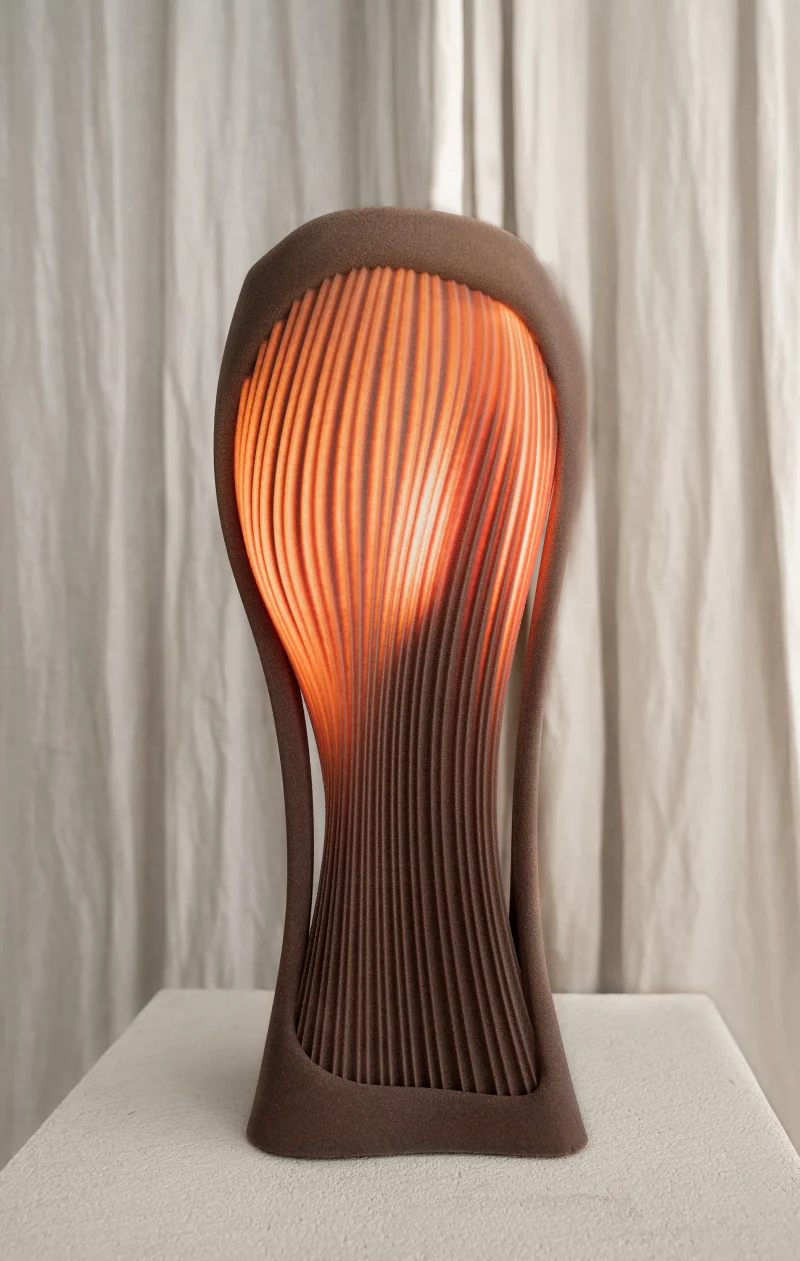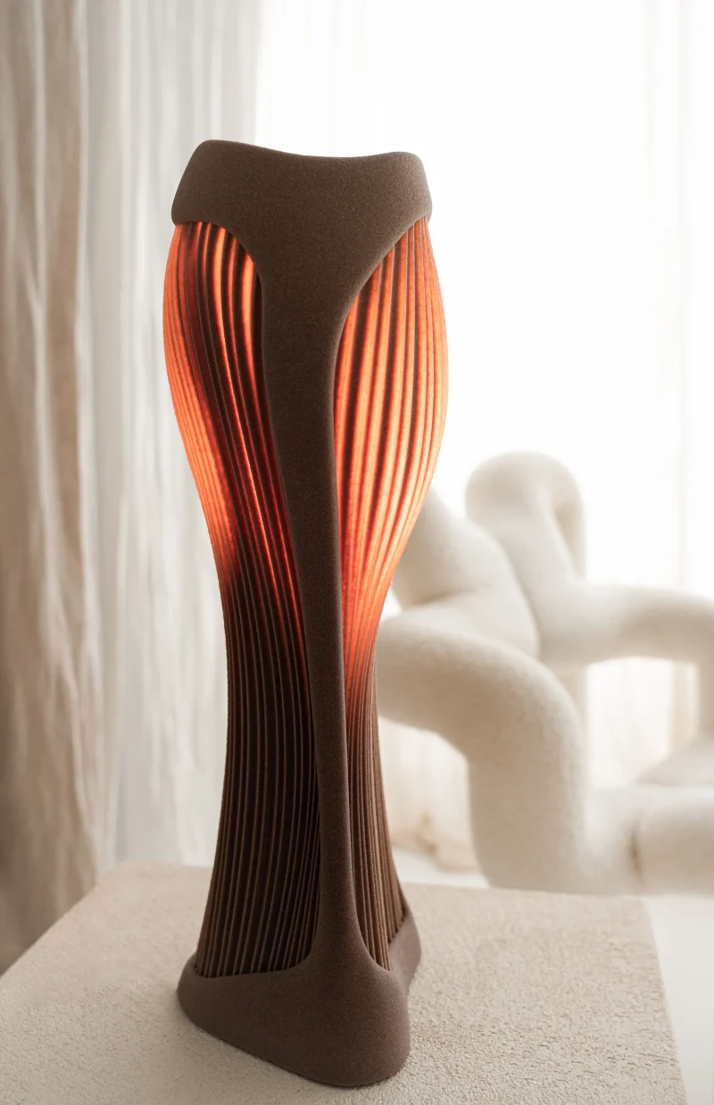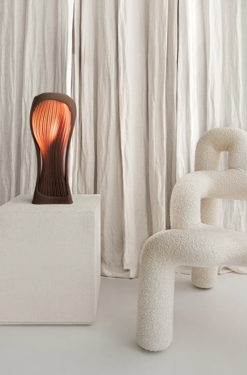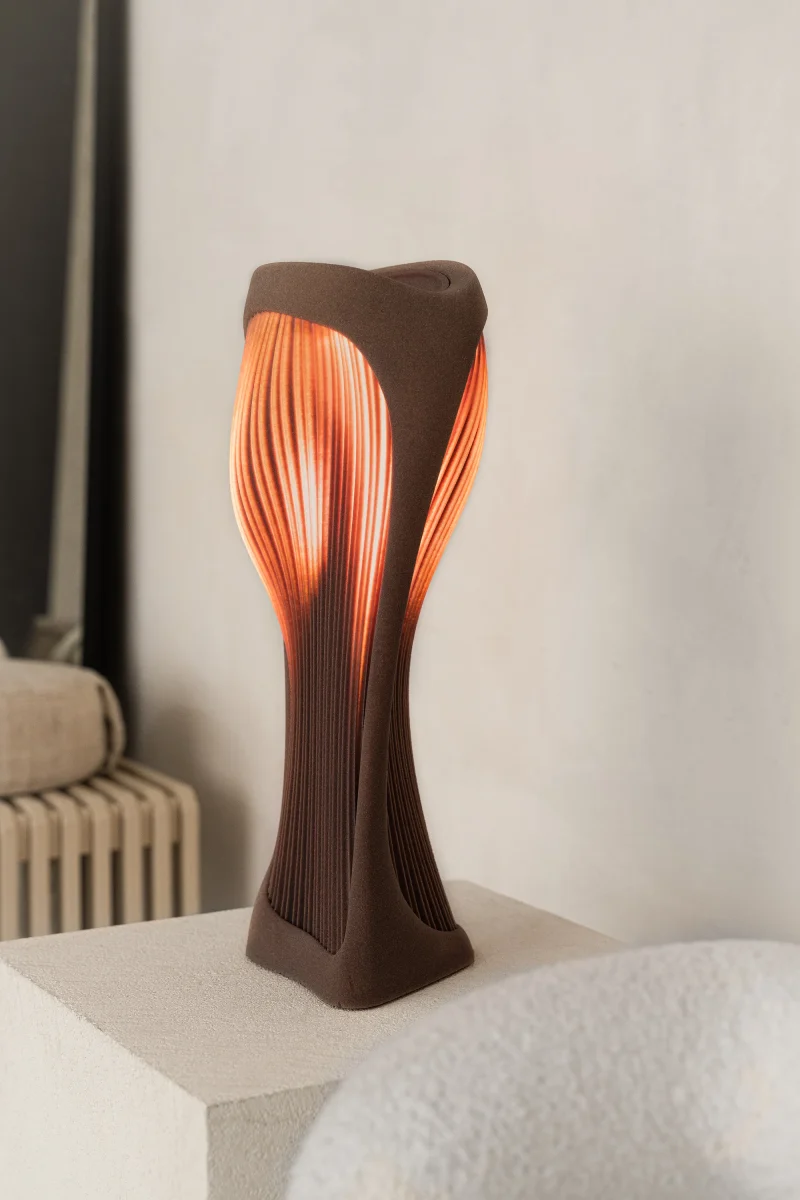 The lamp emanates a warm, ambient glow that evokes the hazy reds and oranges of a desert sunset as the light diffuses through the sand material, creating a captivating interplay of light and shadow. The design language of the Para Dune lamp is both flowing and organic, evoking the undulating shapes and textures of desert sands. Its shape is a balance between delicacy and boldness, creating a simple sculptural beauty.