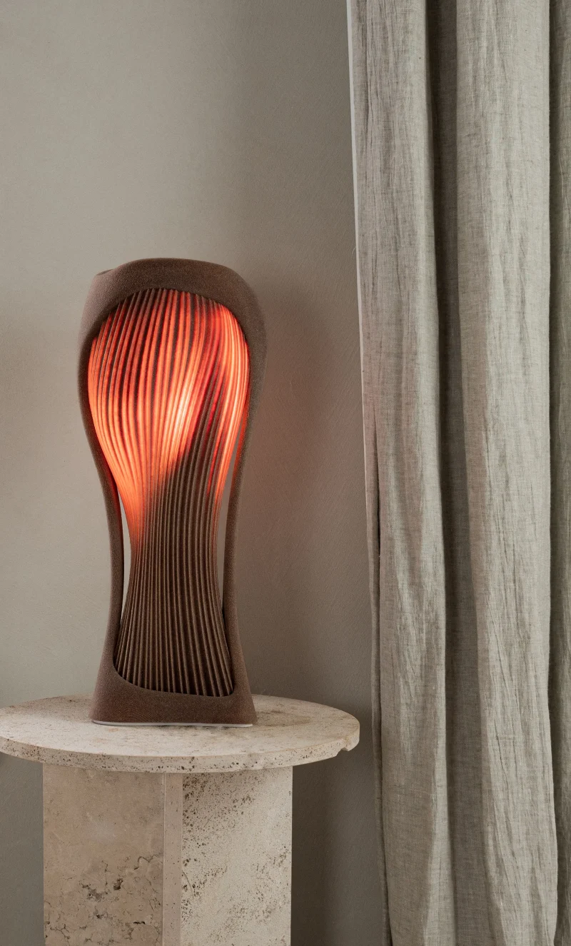 The Dome table lamp, part of the Dune Collection, was inspired by the natural beauty of the desert landscape and has been meticulously crafted using advanced 3D printing technology from quartz sand.