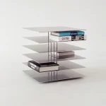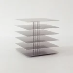 The Domino side table by Ford Bostwick Studio is a masterful interpretation of architectural minimalism inspired by Le Corbusier’s Dom-Ino House. Its precisely arranged metal plates appear to float effortlessly in space, creating an illusion of weightlessness and structural simplicity.