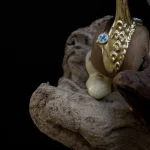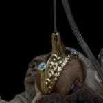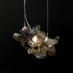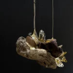 ‘Drift Blossom’ by Leo Maher is a hanging light produced using scavenged wooden elements and antique free-blown glass. Drift Blossom draws together various wooden elements found along the coast surrounding Athens. These wooden elements are then sculpted to morph organically around one another. Re-purposed antique glass pieces are fitted into place on both sides in order to diffuse the central light source. Custom made brass hanging-brackets are sculpted to host the hanging assembly.