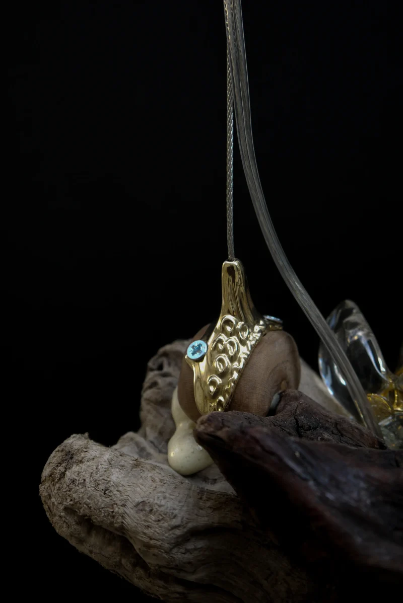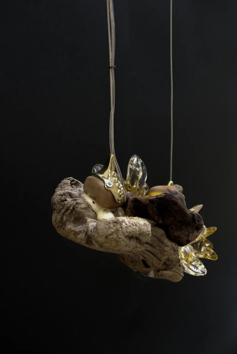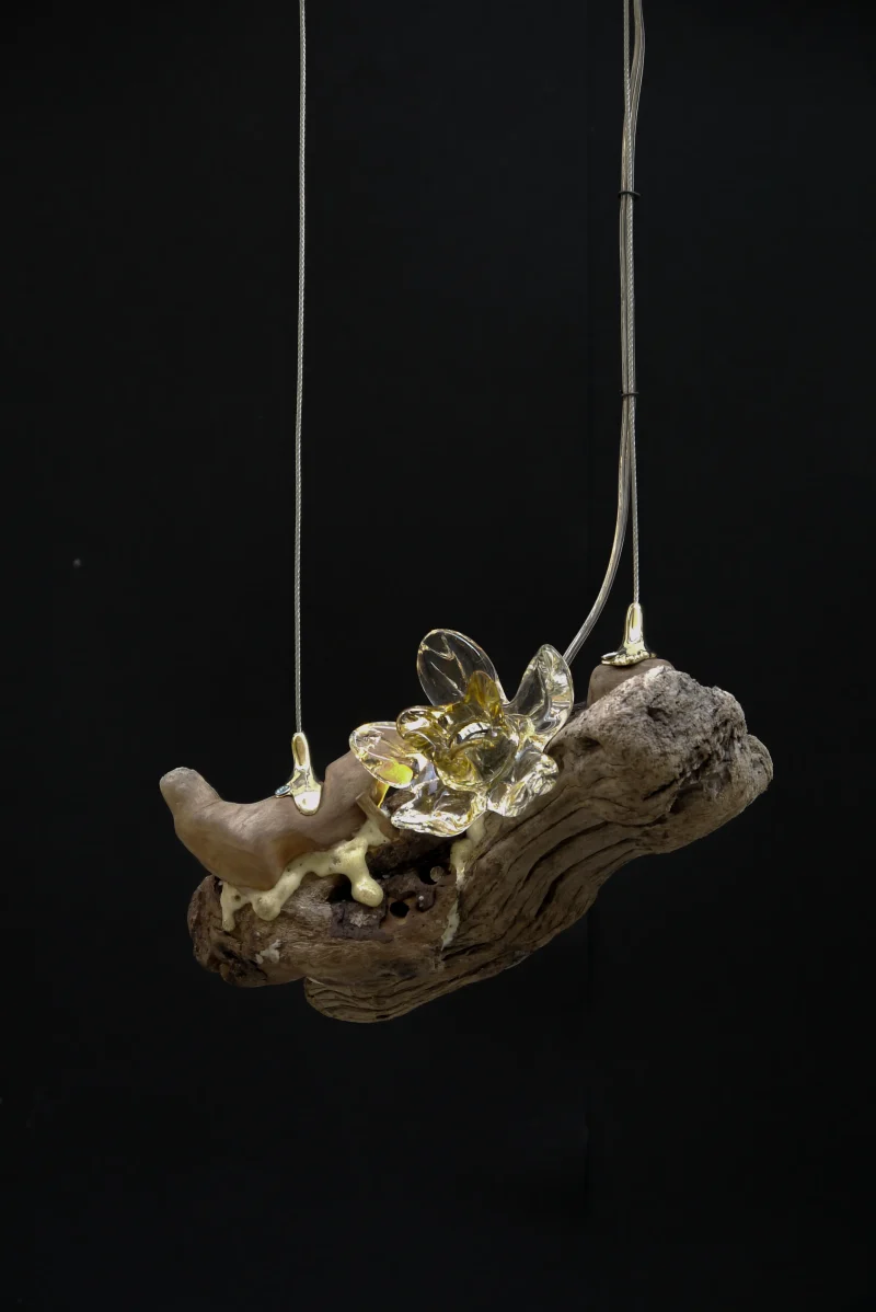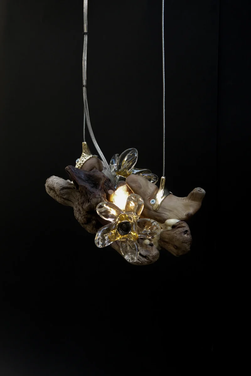 ‘Drift Blossom’ by Leo Maher is a hanging light produced using scavenged wooden elements and antique free-blown glass. Drift Blossom draws together various wooden elements found along the coast surrounding Athens. These wooden elements are then sculpted to morph organically around one another. Re-purposed antique glass pieces are fitted into place on both sides in order to diffuse the central light source. Custom made brass hanging-brackets are sculpted to host the hanging assembly.