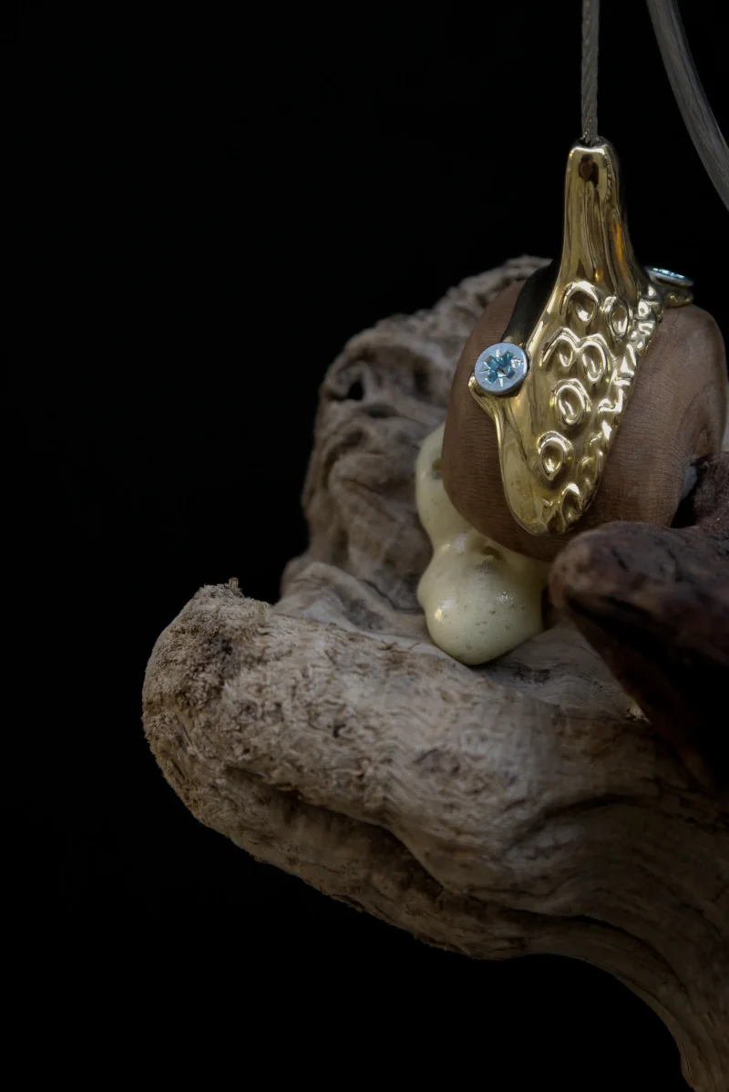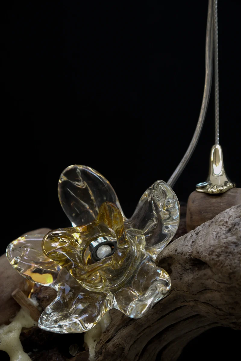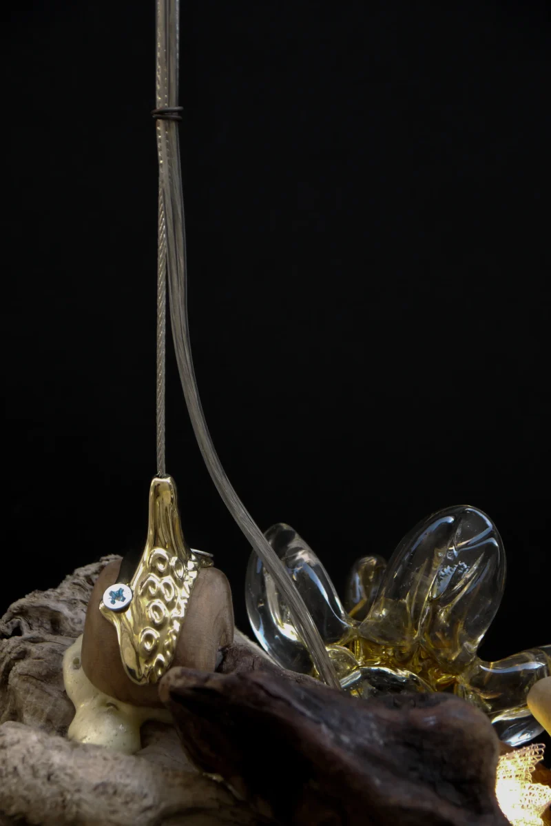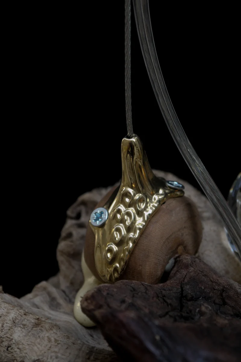 ‘Drift Blossom’ by Leo Maher is a hanging light produced using scavenged wooden elements and antique free-blown glass. Drift Blossom draws together various wooden elements found along the coast surrounding Athens. These wooden elements are then sculpted to morph organically around one another. Re-purposed antique glass pieces are fitted into place on both sides in order to diffuse the central light source. Custom made brass hanging-brackets are sculpted to host the hanging assembly.