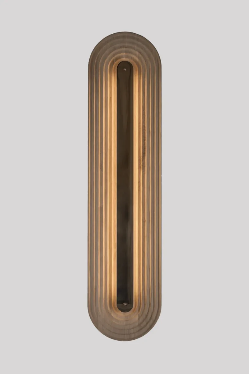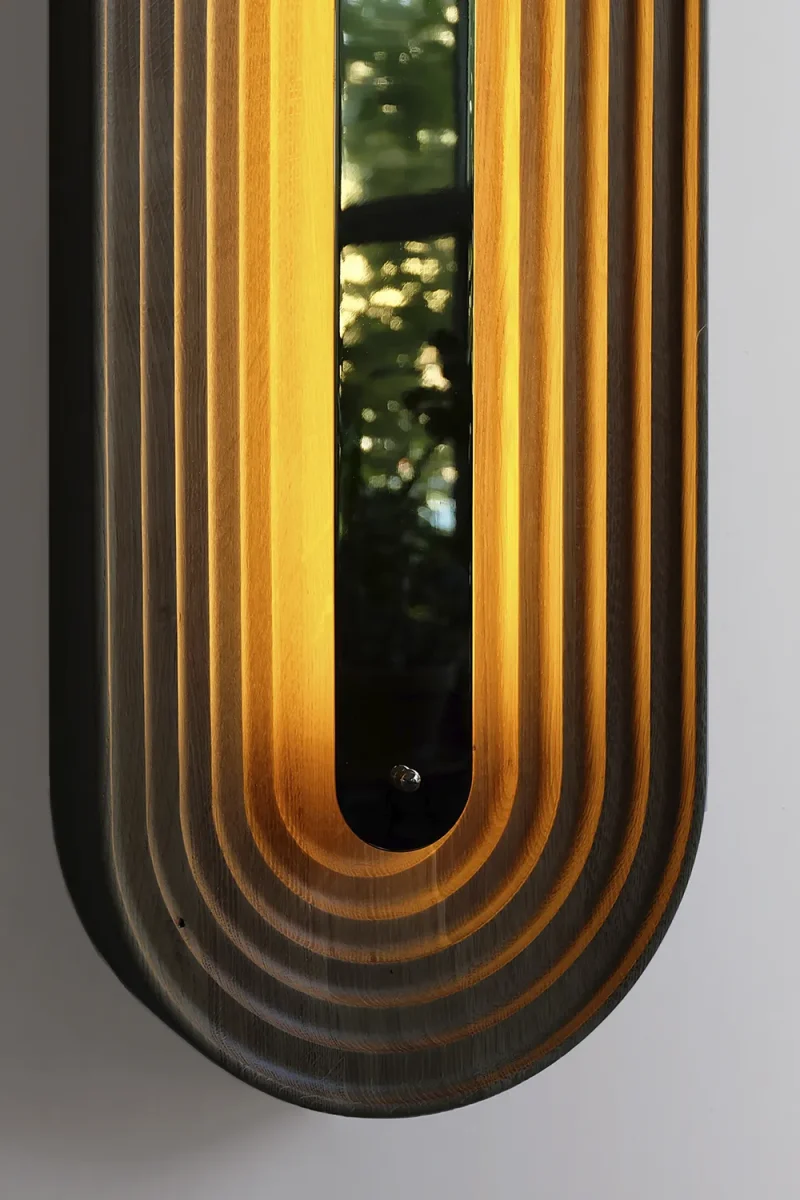 The Dromos lamp, by Polish design studio, Hasik Design, evokes an ancient stadium, its form crafted from solid, hand-polished oak wood, showcasing durability and nobility. The recessed, illuminated, milled levels in the material create a captivating play of light. Behind the brass facade, the concealed light source adds a touch of soft and decorative illumination, incorporating distinct Art Deco elements.