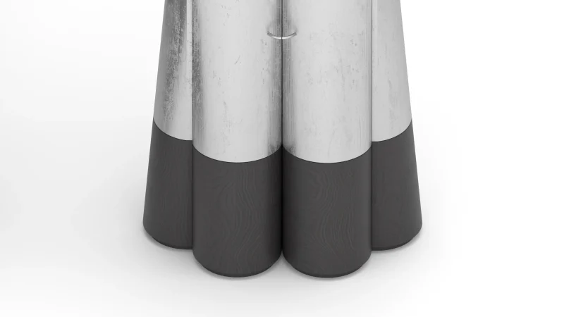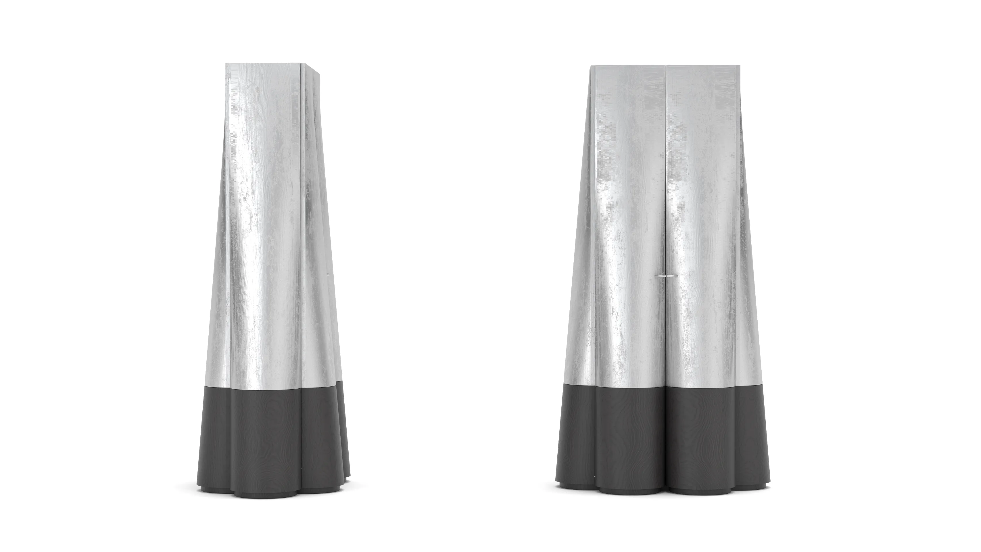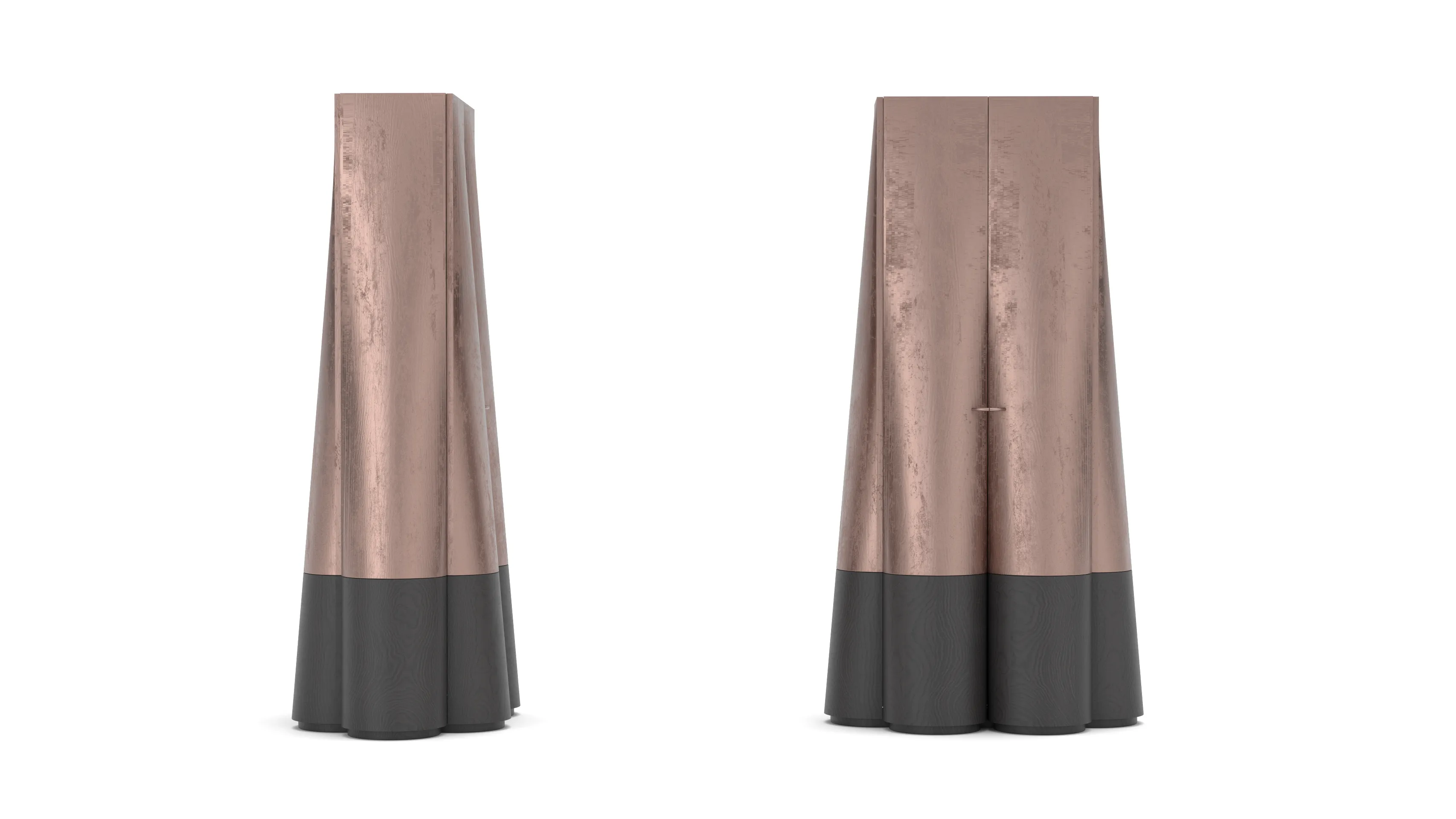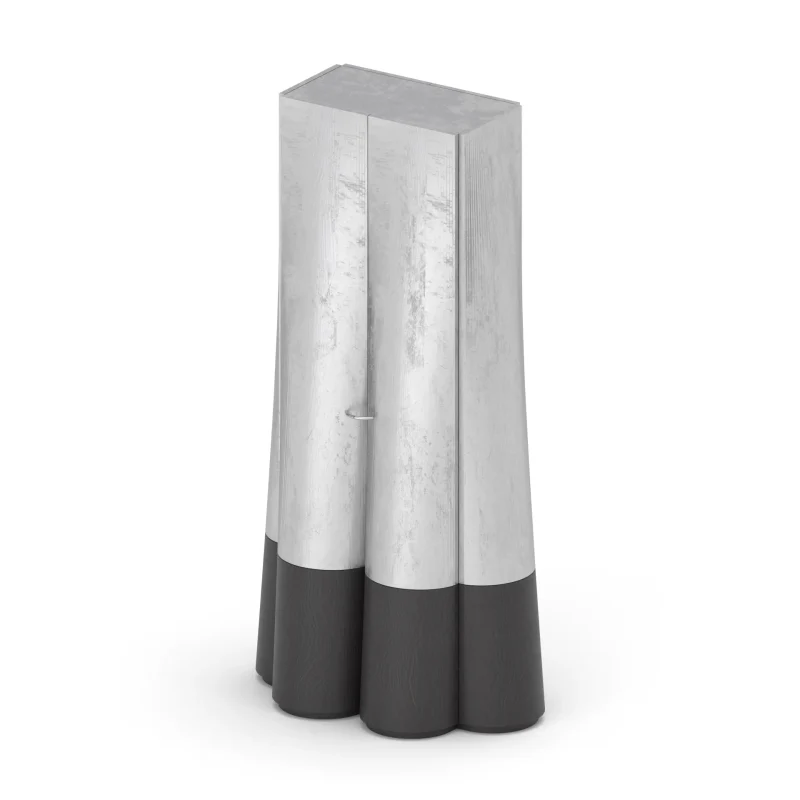 ‘GRAIN OF TIME’ reinterprets its legacy with a contemporary, architectural clarity. From a clean linear top, the cabinet subtly widens into a fluted base, recalling Deco’s verticality and geometry without replicating its ornament. Its stratified planes reveal structure over surface, while a gradual shift in material treatment suggests evolution: the depth of reclaimed teak giving way to a metallic sheen through delicate foiling. At once functional and sculptural, ‘GRAIN OF TIME’ honors continuity, material intelligence, and the enduring spirit of Deco.