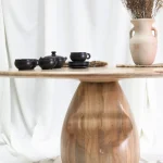 Handcrafted with simple yet powerful curves, this table showcases the beautiful hues of solid Guarango wood, accentuating the natural movement within the forms. All edges are rounded to the touch, imparting softness and warmth, while its top diameter of 63 inches comfortably seats six to eight people.