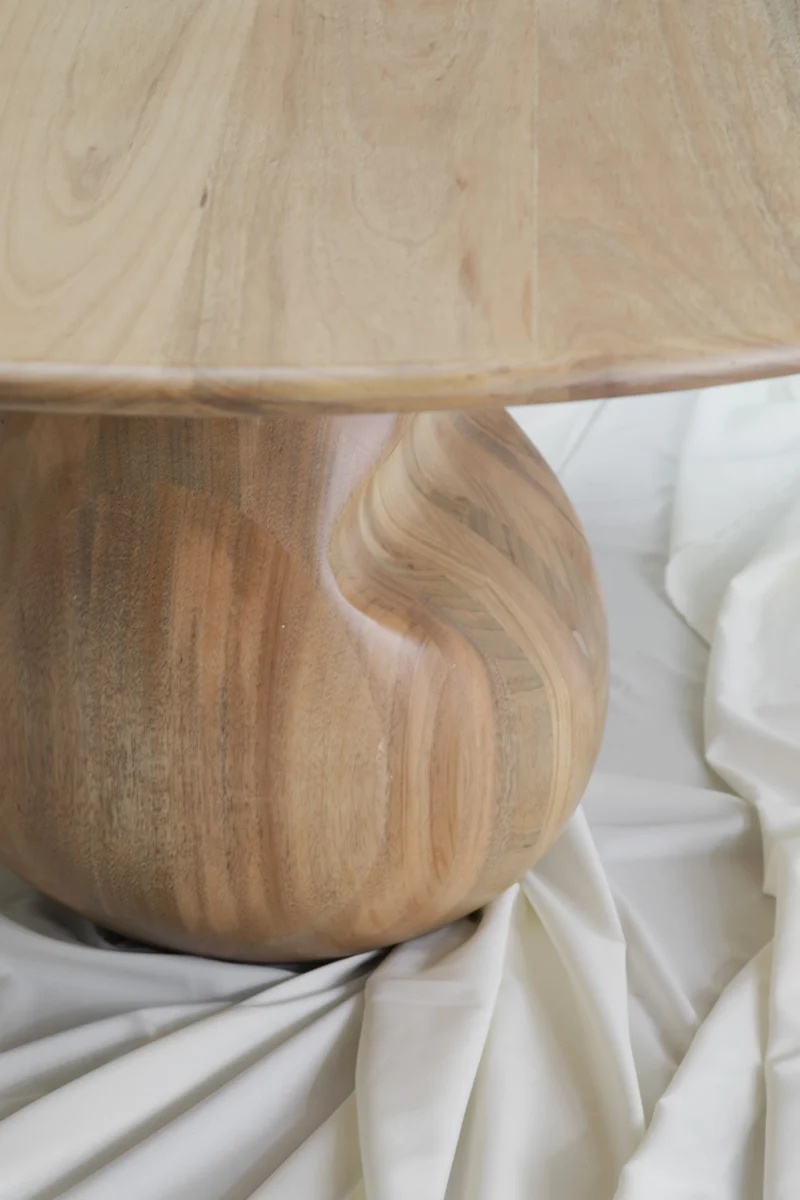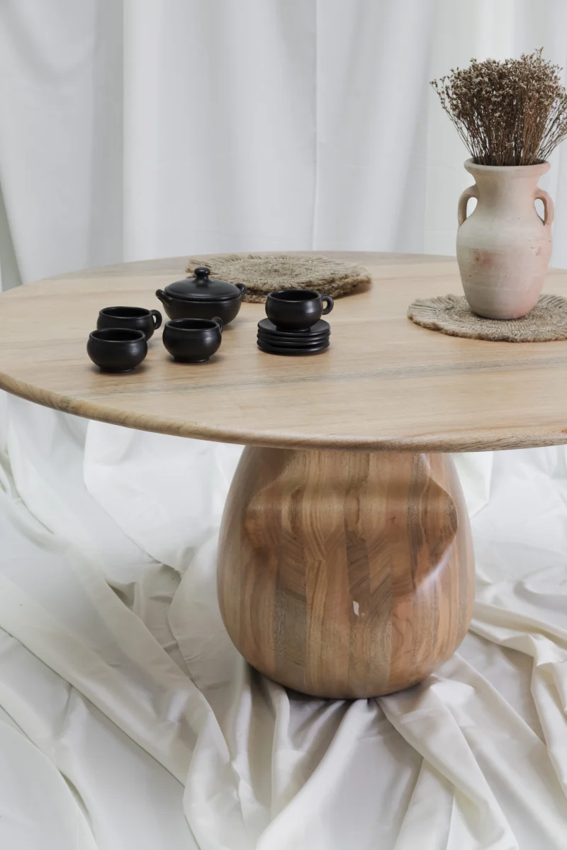 Handcrafted with simple yet powerful curves, this table showcases the beautiful hues of solid Guarango wood, accentuating the natural movement within the forms. All edges are rounded to the touch, imparting softness and warmth, while its top diameter of 63 inches comfortably seats six to eight people.