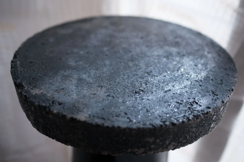 Dross Tables are made from the recovery of steel slag, quartz and residual heat that form a large percentage of the waste by-products of the molten iron processing industry. These waste materials are put in a mould and baked into the heat that is dissipated from the steel furnace, requiring no new energy to create them. The process is unique to steel factories and has been invented through collaboration with factory workers.