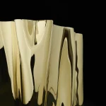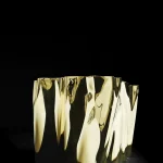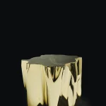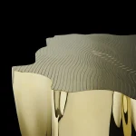 Its unique structure, with a vertical sheet metal wall that makes a unique and sculptural wave turn, evokes the idea of a continuous flow, as if the metal had been forged by a golden wind that gives unique shapes from time to time, shaping elegant and fluid curves.