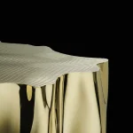 The smooth surface of the plane, engraved with parallel lines, generates intriguing optical illusions each look offers a new interpretation, a sensory journey that recalls the dunes of a golden desert.